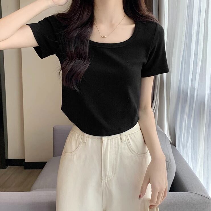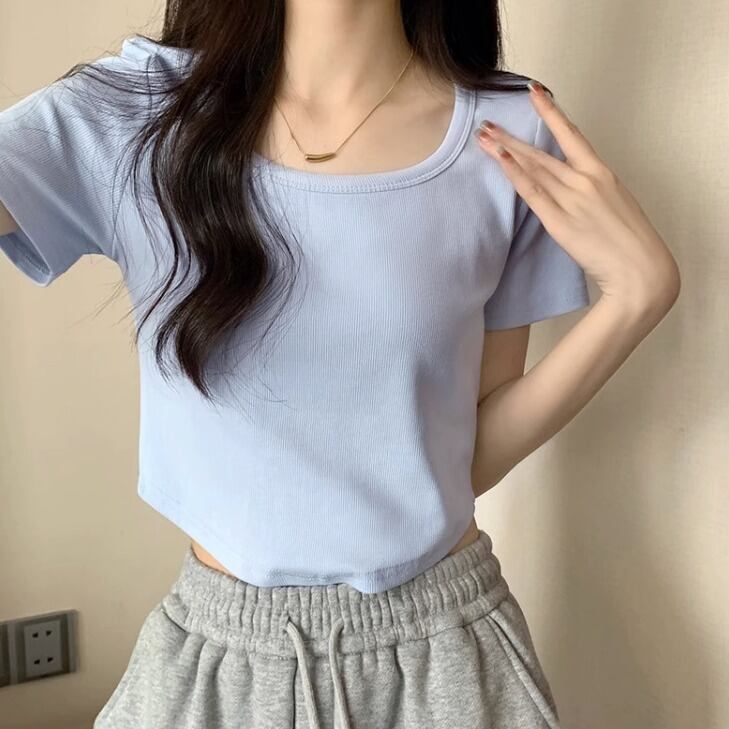 トップス Tシャツ ショート ショート丈 袖あり 半袖 Uネック 襟なし ノーカラー リブ 伸縮性 ストレッチ 柔らか きれいめ シンプル カジュアル おしゃれ レトロ こなれ感 ラフ スポーティー キュート ルーズ 個性的 抜け感 ひかえめ ナチュラル 爽やか 活発 若見え 無地 夏 10代 20代 30代 レディース 女性用 お出かけ 休日 運動 アウトドア バカンス ショッピング アクティビティ 着回し 普段使い 韓国系 楽ちん 定番 トレンド S M L XL ホワイト ブラック ベージュ 水色