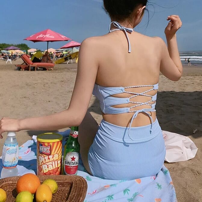 爽やかなライトブルーのストライプが映える可愛らしい印象の水着は、セパレートタイプだから脱着も簡単。胸元やショーツには、さり気なく小さなリボンがあしらわれ、バックシルエットの編み上げデザインが程よいセクシーさをプラスしてくれます。若見えデザインだから、とことんガーリーでアクティブなスタイリングが叶いますよ◎
