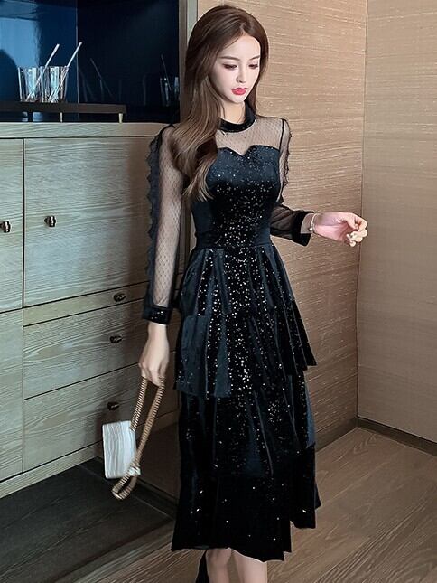 ワンピース レディース ドレス 送料無料 クルーネック ティアード ラメ グリッター きらきら チュール メッシュ レース ひざ下 フリル フォーマルドレス パーティドレス ひざ下 袖あり 長袖 Vネック カットアウト シフォン 切り替え パフスリーブ ドッキング レース チュール ハイウエスト 透け感 シースルー エレガント 大人可愛い きれいめ ゴージャス 華やか 上品 ブライダル オケージョン 美脚 脚長 高見え 格上げ 春 お呼ばれ お出かけ パーティー 二次会 フォーマル S M L ブラック
