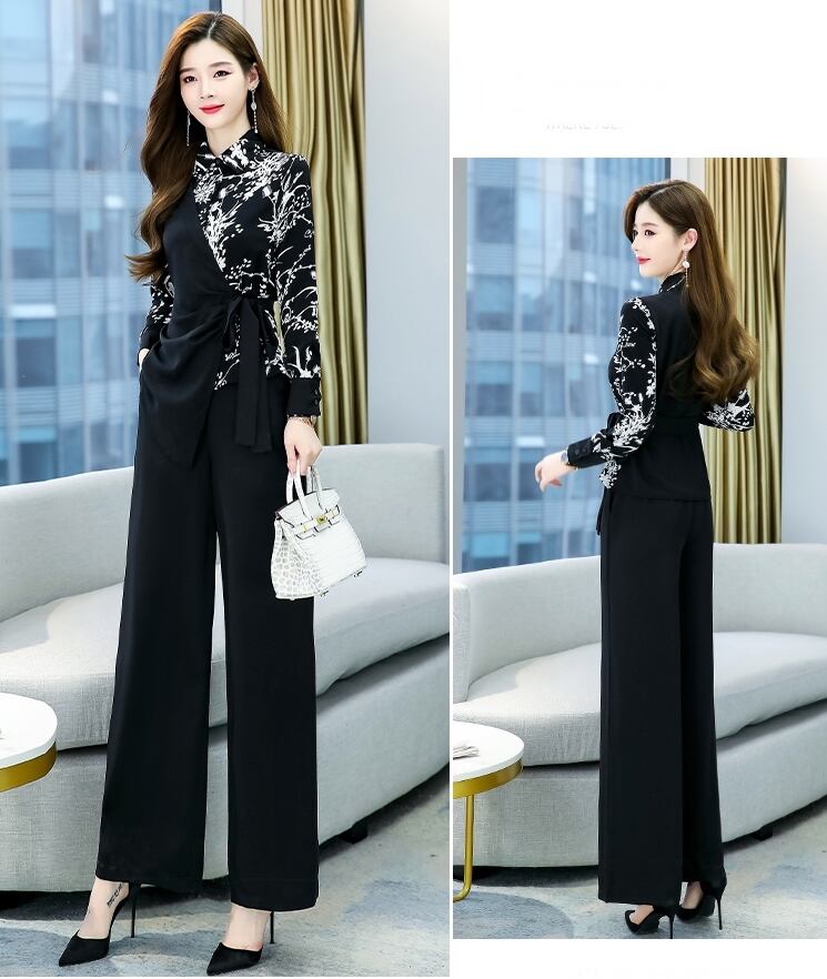 ゆったりしたシルエットのアシンメトリーブラウスとワイドパンツのセットアップ。