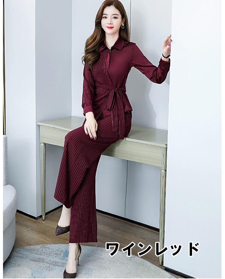 セットアップ トップス パンツ シャツ ブラウス ワイドパンツ ロング丈 袖あり 長袖 ストライプ カシュクール アシンメトリー 襟付き ストレート ワイド ポケット 前開き コンサバ 上下セット 2点セット ツーピース セット きれいめ シンプル カジュアル おしゃれ お洒落 かっこいい こなれ感 ラフ 都会的 ラグジュアリー 無地 春 夏 20代 30代 40代 レディース 女性用 ママ ビジネス OL 通勤 お出かけ 休日 旅行 レストラン ショッピング 着回し 普段使い 楽ちん 体型カバー