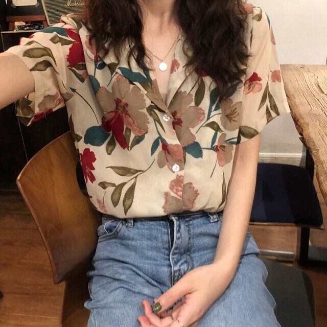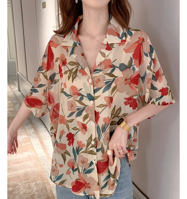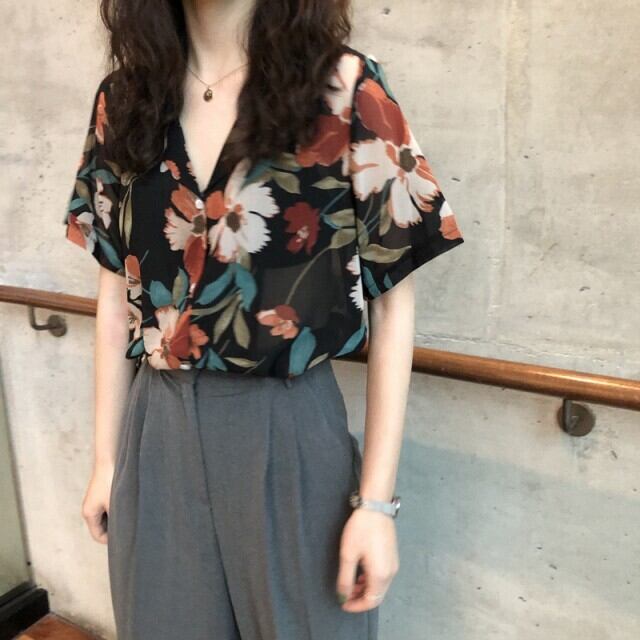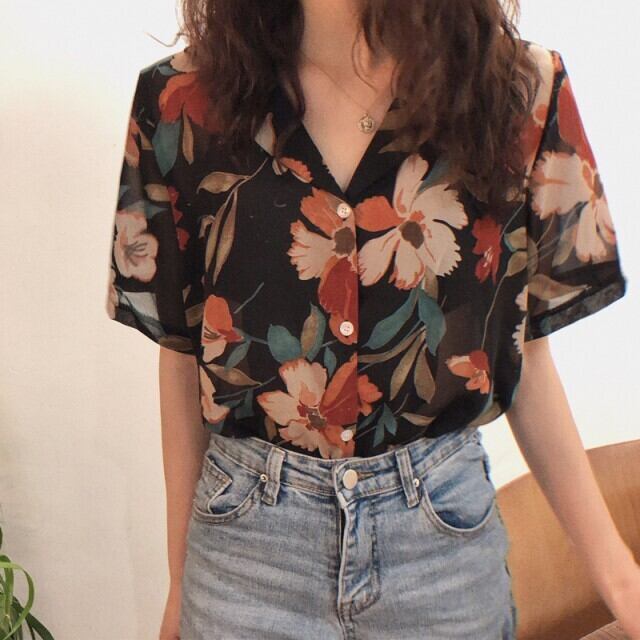 トップス レディース 送料無料 2色 シャツ ブラウス 半袖 襟付き 開襟シャツ ボタニカル 花柄 モノトーン ゆったり ビッグシルエット オーバーサイズ マニッシュ メンズライク 抜け感 こなれ感 シック クール 個性的 華やか 派手 無地 春 春服 春物 秋 10代 20代 普段使い 重ね着 着回し おしゃれ お洒落 ラフ カジュアル 前開き アプリコット ブラック 涼し 通気性 薄手 ポリエステル シフォンシャツ ワイド 存在感 モード系 エキゾチック デート ワンサイズ