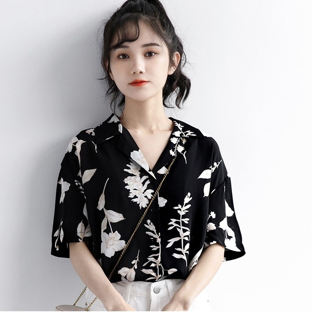 トップス レディース 送料無料シャツ ブラウス ブラック 半袖 襟付き 開襟シャツ ボタニカル 花柄 モノトーン ゆったり ビッグシルエット オーバーサイズ マニッシュ メンズライク 抜け感 こなれ感 シック クール 個性的 華やか 派手 無地 春 春服 春物 秋 10代 20代 普段使い 重ね着 着回し おしゃれ お洒落 ラフ カジュアル 前開き 涼し 通気性 薄手 ポリエステル シフォンシャツ ワイド 存在感 モード系 エキゾチック デート S M L