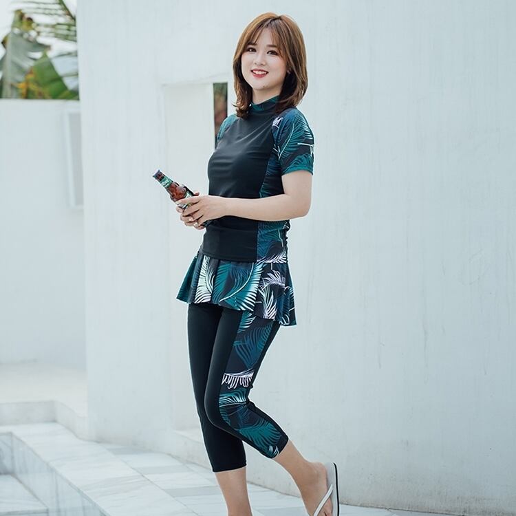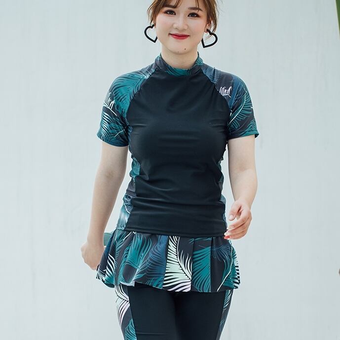スポーティーなボタニカル柄切り替えでスタイルアップにも期待できます。