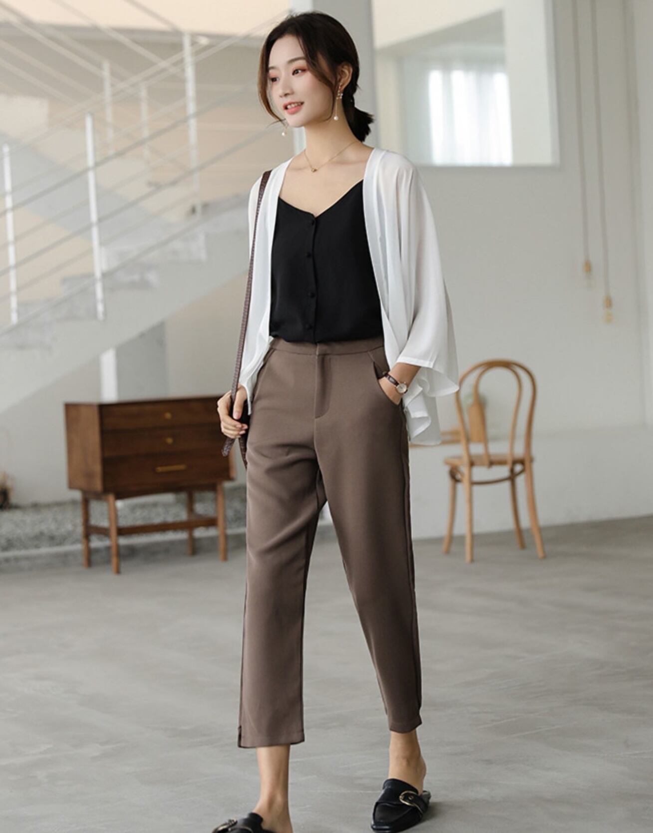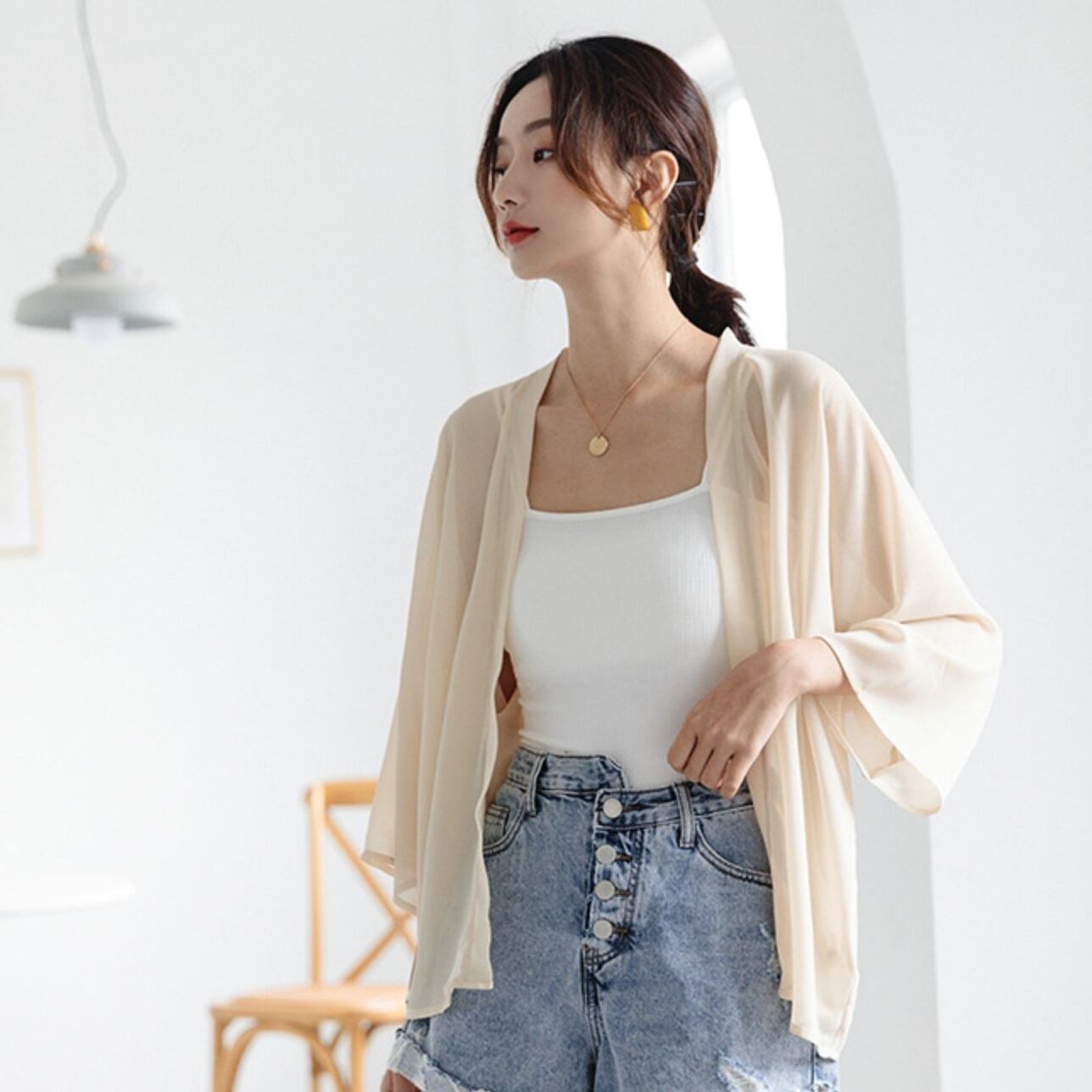 トップス レディース カーディガン 送料無料 3色 ブラウス シャツ ノーカラー 9分袖 切り替え スタンドカラー シフォン シースルー 透け感 シアー 襟なし ーポリエステル ホワイト グレー アプリコット 単色 透け感 こなれ感 抜け感 ガーリー かわいい 可愛い 涼し 通気性 キュート 上品 エレガント きれいめ ラブリー 女の子 お洒落 おしゃれ 春 春服 夏 夏服 10代 20代 デート おでかけ モテ 女子会 普段使い 着回し 重ね着 韓国系 オルチャン S M L XL