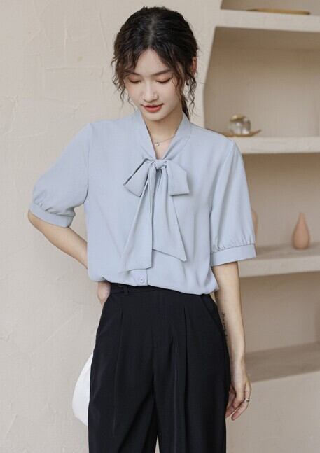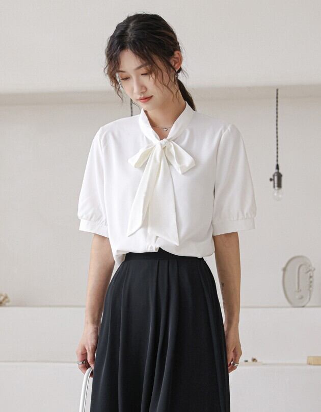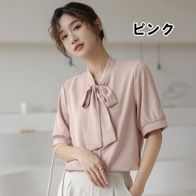 トップス レディース 送料無料 3色 シフォン ボウタイ リボンブラウス 半袖 ドレスブラウス おしゃれ ベーシック スタイル 小顔見せ 着痩せ 体型カバー インスタ トレンド きれいめ かわいい エレガント フェミニン ホワイト ピンク ブルー オフィス 通勤 OL フォーマル キュート ガーリー ギャザー シャーリング 大人かわいい S M L XL 襟付き 透け感 上品 フロントリボン ボウタイ パステルカラー