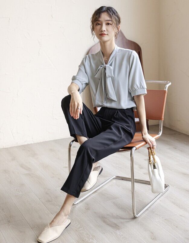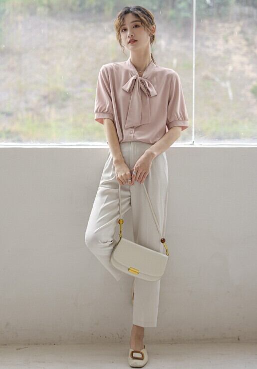 ボウタイリボンのペールトーンが可愛いシフォンブラウス。