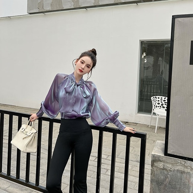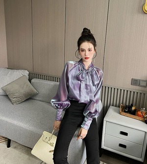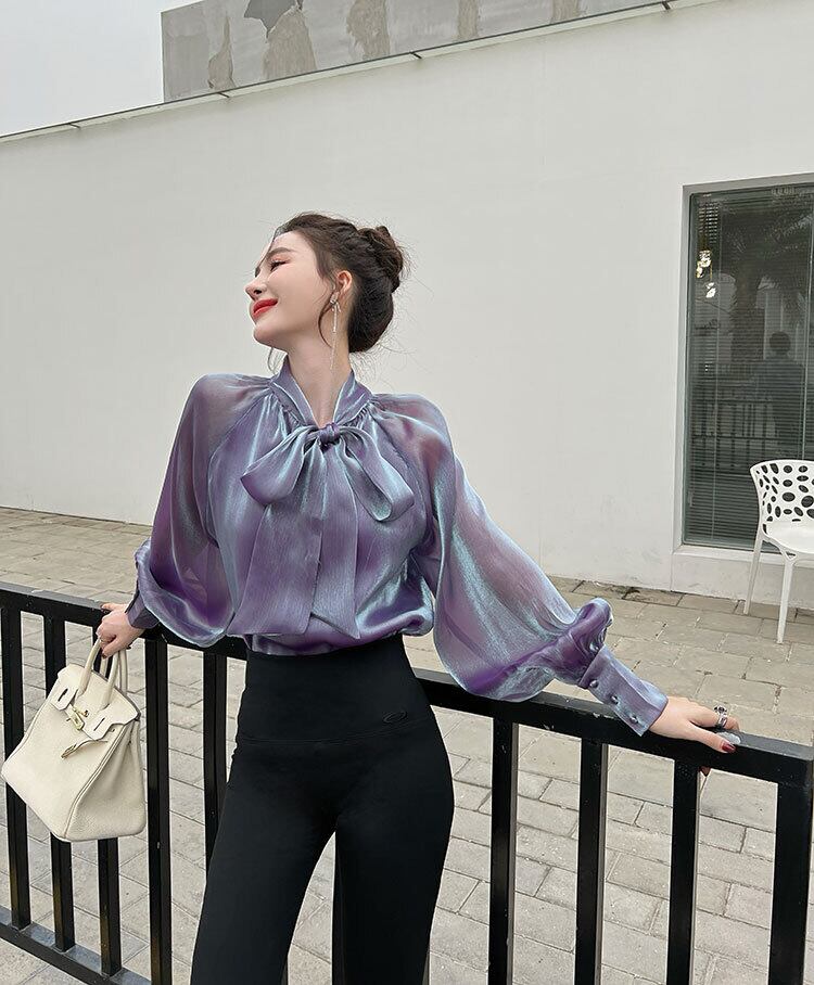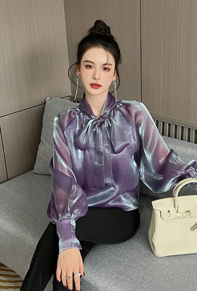トップス レディース 送料無料 2色 シャツ ブラウス 長袖 スタンドカラー チュール サテン シルク 透け感 シアー シースルー ハイネック リボンタイ ゆったり 抜け感 こなれ感 シック クール カッコイイ かっこいい 個性的 華やか 派手 無地 春 春服 春物 秋 秋服 秋物 10代 20代 普段使い 重ね着 着回し おしゃれ お洒落 ラフ カジュアル アプリコット パープル 涼し 通気性 薄手 ポリエステル シフォン シフォンシャツ ワイド 存在感 モード系 エキゾチック デート S M L