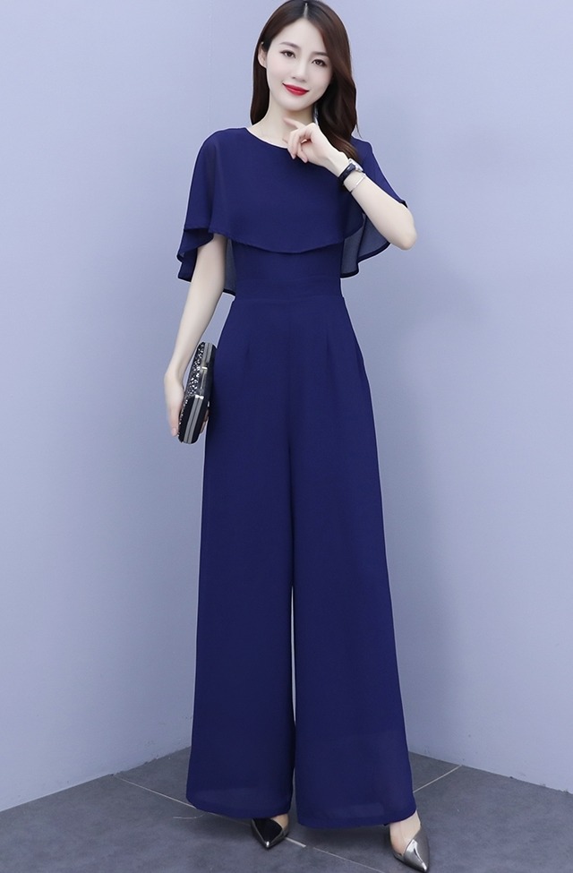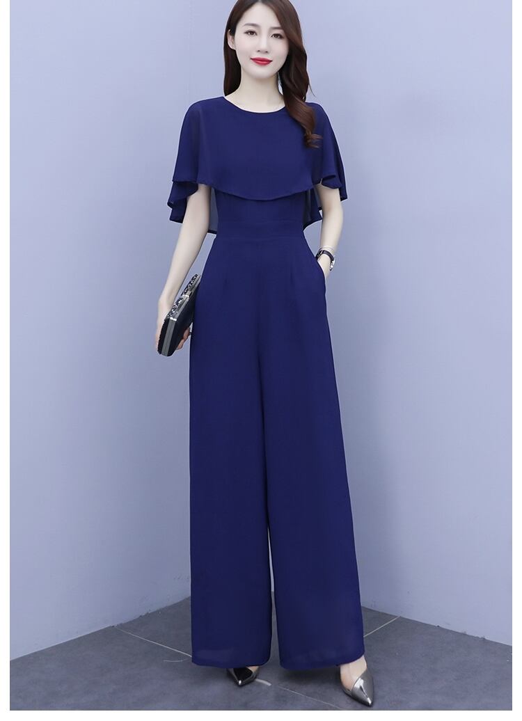 ケープのようなデコルテデザインが華やかなオールインワン。