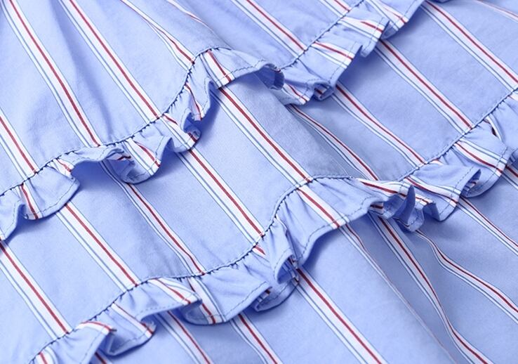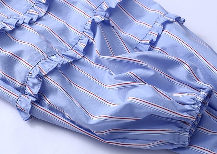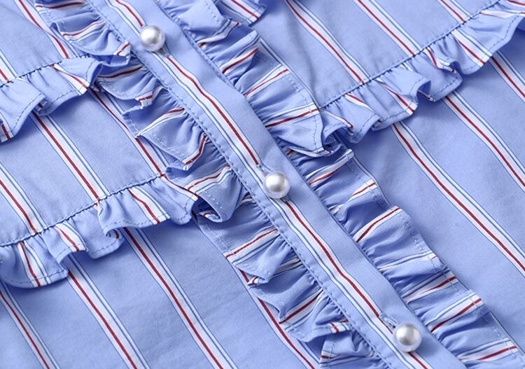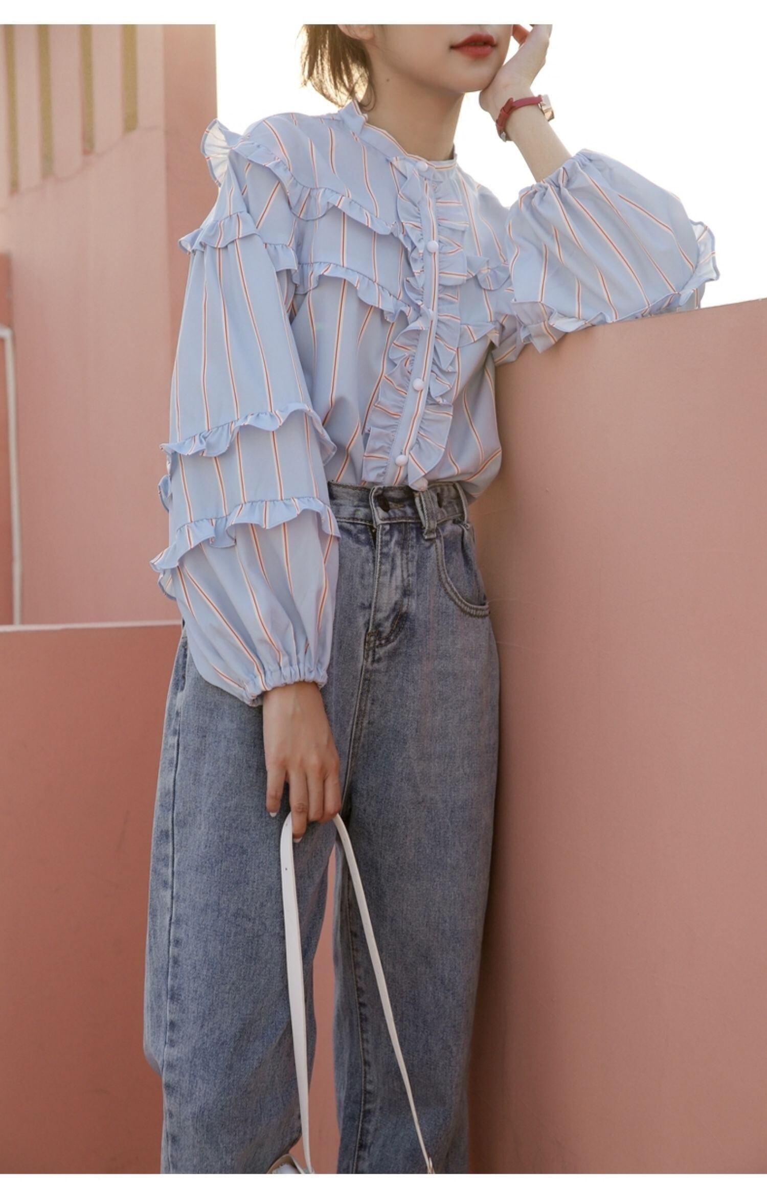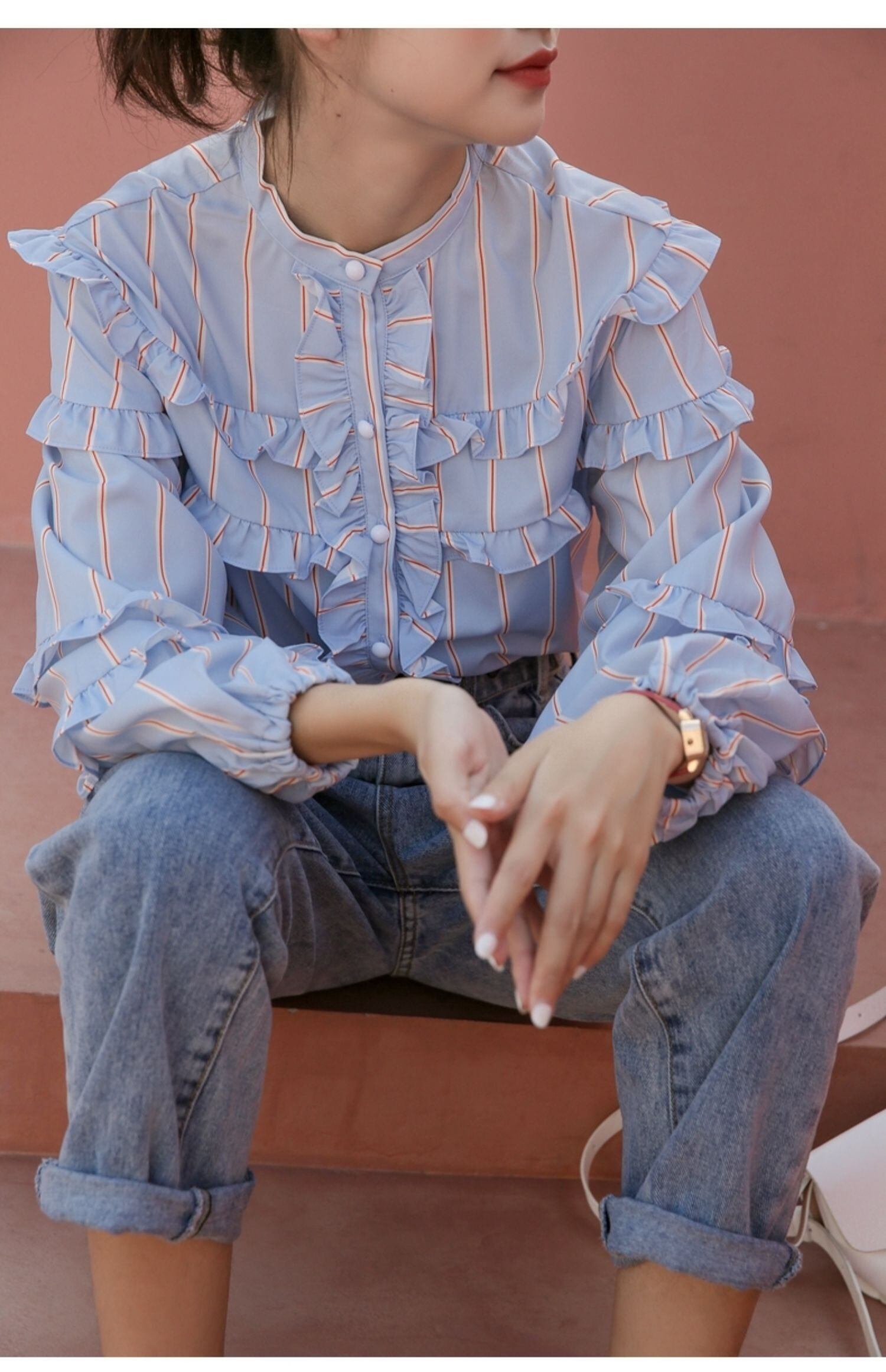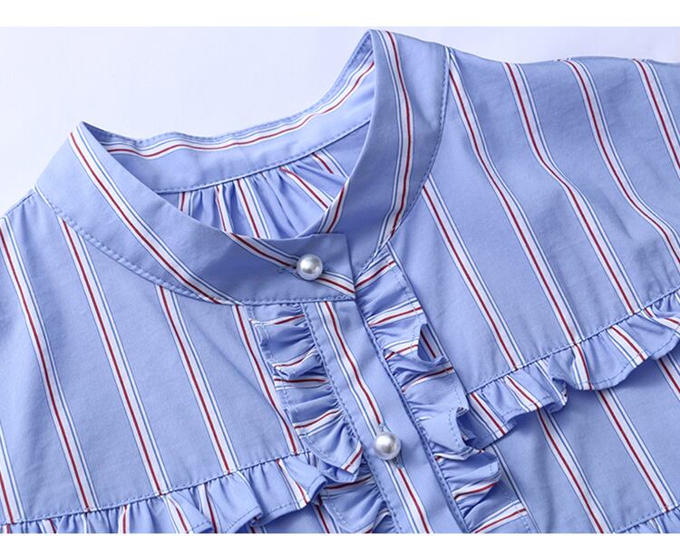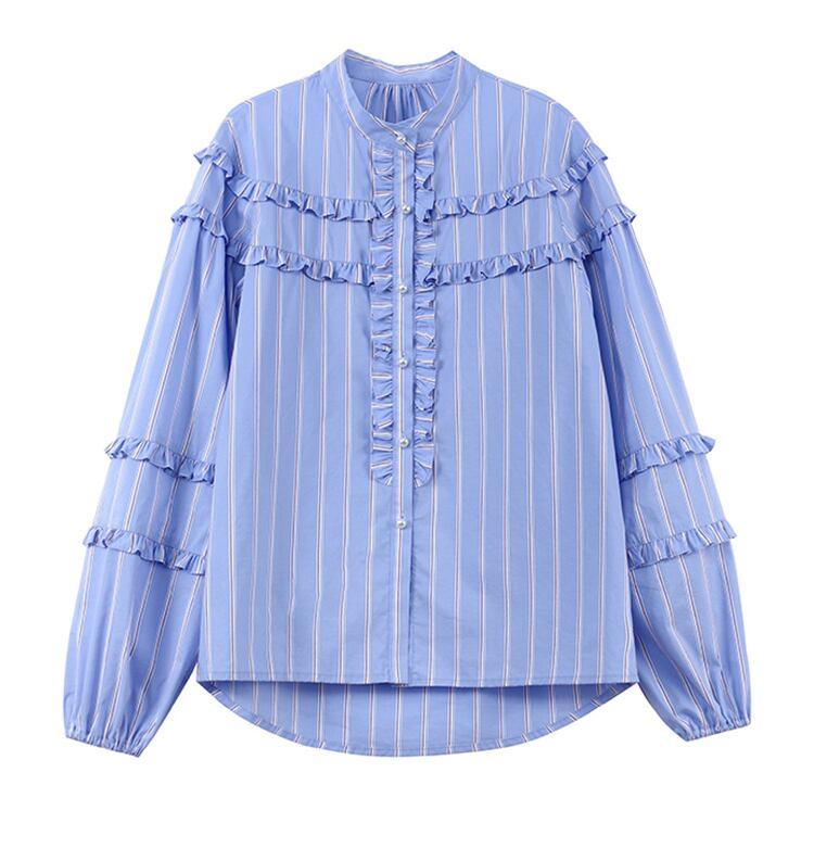 トップス レディース 送料無料 ブラウス シャツ フリル 長袖 襟なし ストライプ パールボタン スタンドカラー プチハイネック ポリエステル ブルー 単色 透け感 こなれ感 抜け感 ガーリー かわいい 可愛い 涼しい 上品 エレガント きれいめ ラブリー 女の子 お洒落 おしゃれ 春 春服 夏 夏服 10代 20代 デート おでかけ モテ 女子会 普段使い 着回し 重ね着 定番 韓国系 オルチャン ブルー XS S M