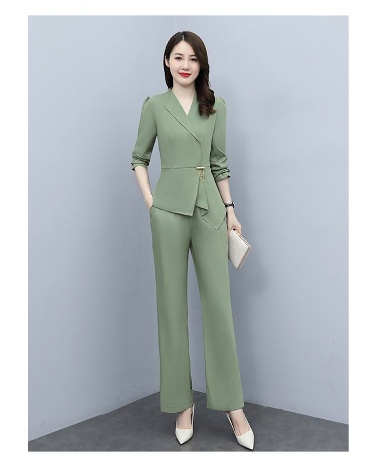 アシンメトリーな留め具とイレギュラーヘムがハンサムなパンツスーツセット。
