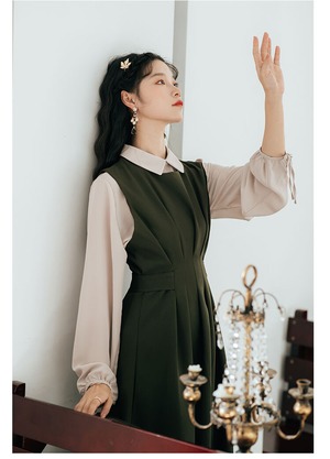 シックなグリーンが大人っぽく、ハイウエストで綺麗なAラインを作ります。