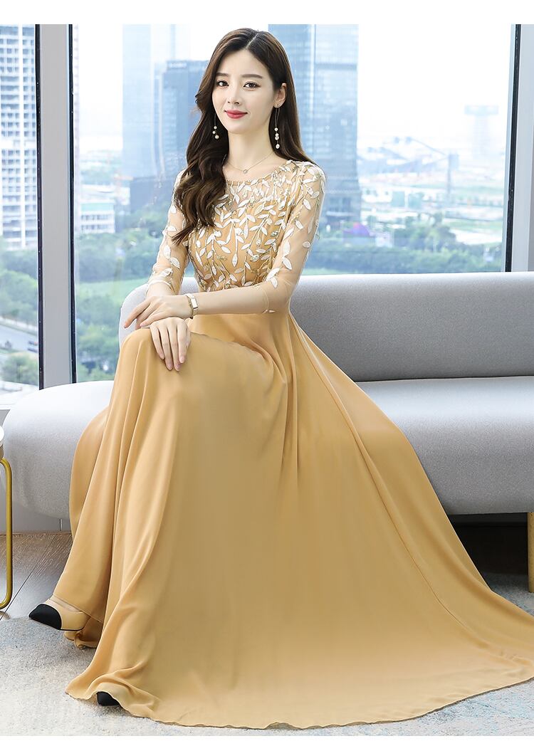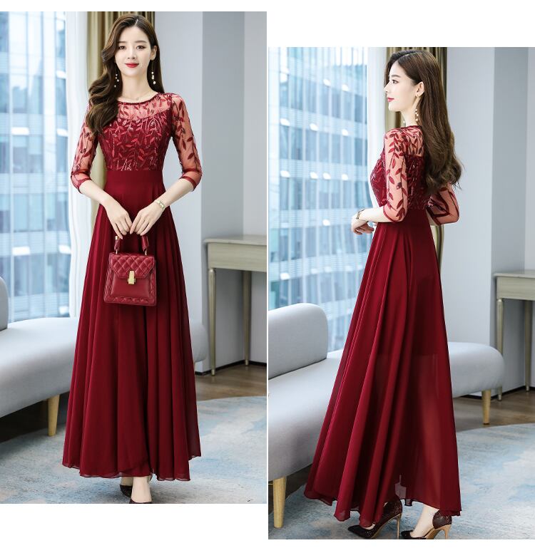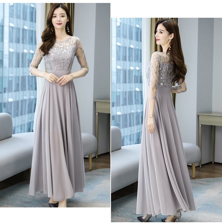 スパンコールのリーフ模様と透け感がフェミニンなロングワンピースドレスです。