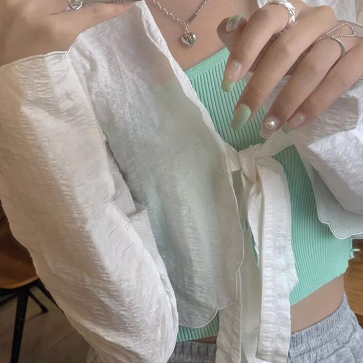 レディース トップス カーディガン 上着 羽織 ショート 長袖 ボリューム袖 パフスリーブ 襟なし ノーカラー ワイド オーバーサイズ リボン 前開き スカラップ 薄手 さらさら 凹凸感 大人可愛い シンプル カジュアル おしゃれ レトロ こなれ感 ラフ ガーリー ルーズ 個性的 存在感 抜け感 ラブリー キュート ラグジュアリー ロマンティック ナチュラル 休日感 ハイエンド フェミニン セクシー 大人女子 ニッチ 無地 春 夏 デート パーティー リゾート ビーチ お呼ばれ 韓国 楽ちん 体型カバー