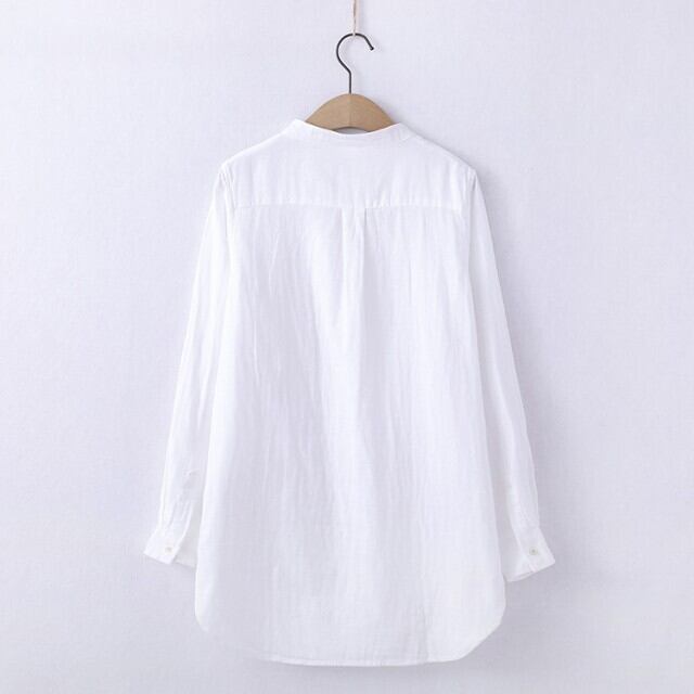 シンプルなバンドカラーが大人っぽいシャツブラウスです。