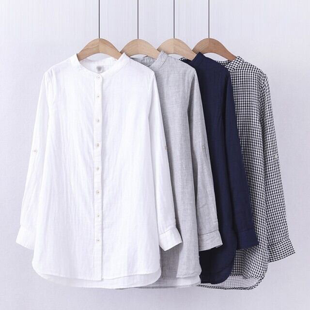 トップス レディース 送料無料 ブラウス シャツ フリル ガーゼ 長袖 襟なし バンドカラー スタンドカラー 透け感 こなれ感 抜け感 ガーリー かわいい 可愛い 涼しい 上品 エレガント きれいめ ラブリー 女の子 お洒落 おしゃれ 春 春服 夏 夏服 10代 20代 デート おでかけ モテ 女子会 普段使い 着回し 重ね着 韓国系 オルチャン ホワイト グレー ネイビー チェック M L XL
