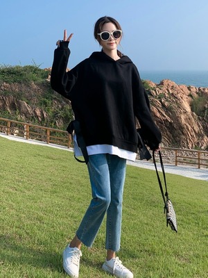 シンプルカットソーとパーカーをレイヤードしたようなトップスです。