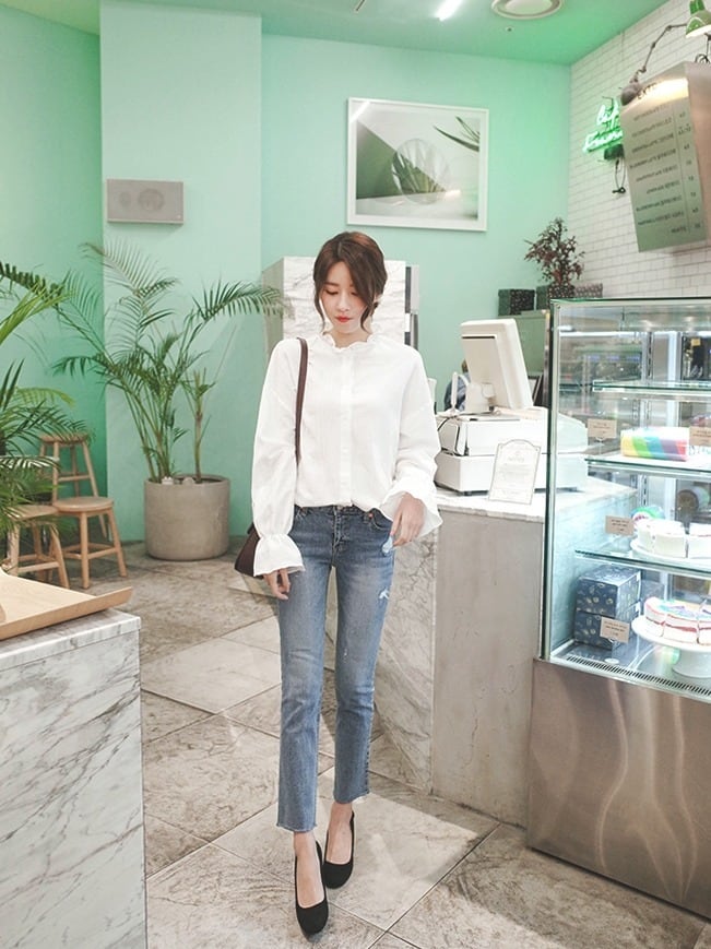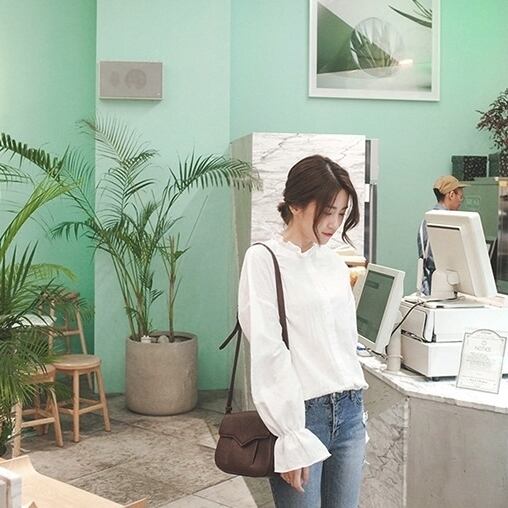 フリルのスタンドカラーとキャンディースリーブがフェミニンです。