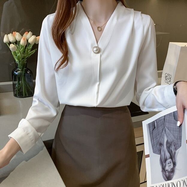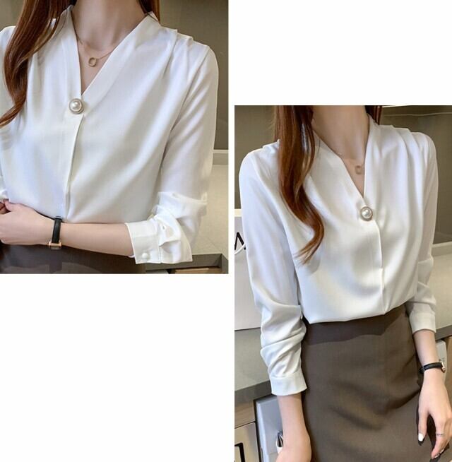 スタイリッシュな大きめパールボタン付きのサテン調ブラウス。