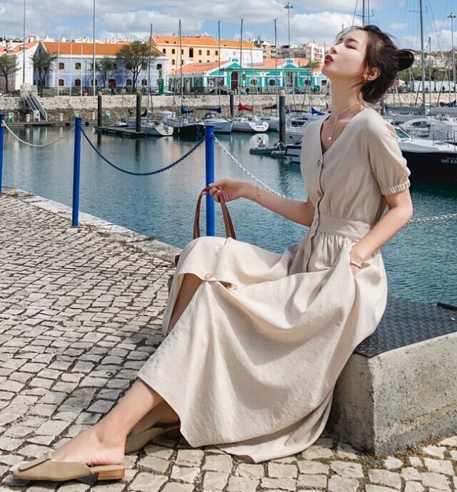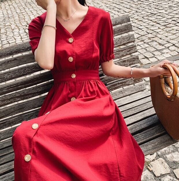ワンピース レディース 2色 袖あり 半袖 Vネック スリム タイト 細身 ストレート ギャザー ハイウエスト 大人 上品 おしゃれ お洒落 かっこいい ボタン 大人可愛い 大人女子 個性的 クール モード系 セクシー 主役級 存在感 レッド ベージュ 20代 30代 40代 パーティー イベント オフィス ビジネス OL 通勤 着回し 普段使い 重ね着 韓国系 オルチャン コーデ スタイル 美脚 脚長 トレンド 二次会 結婚式 流行 S M L