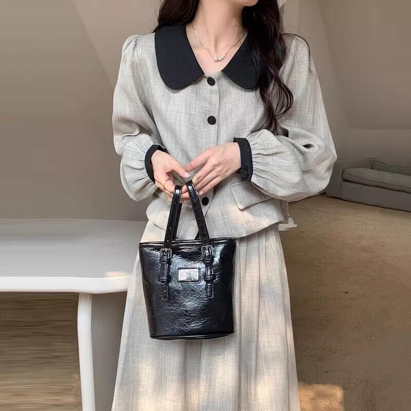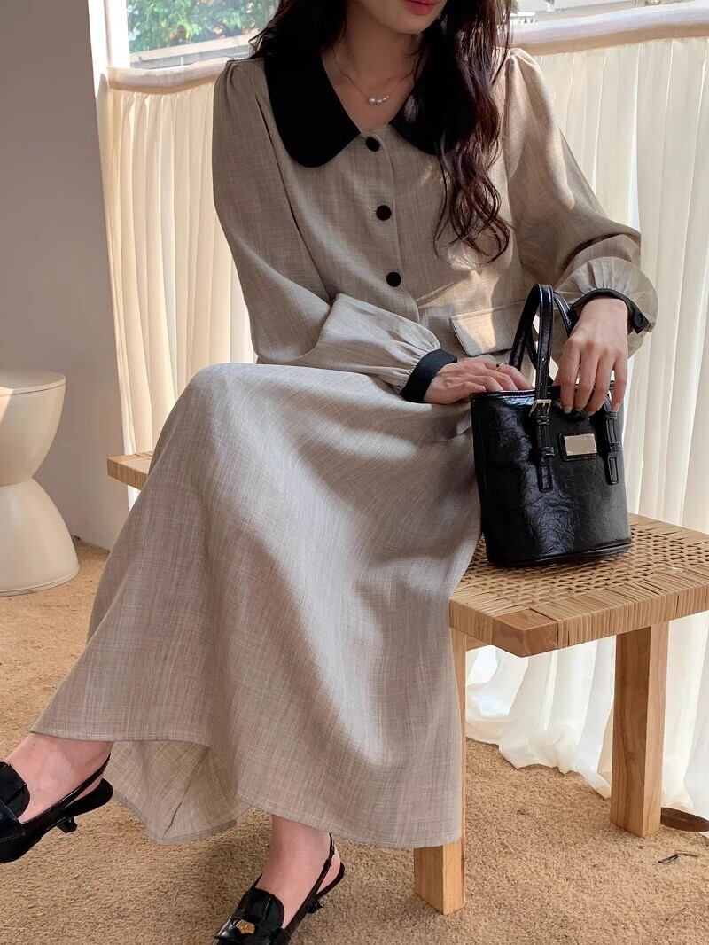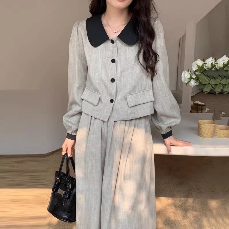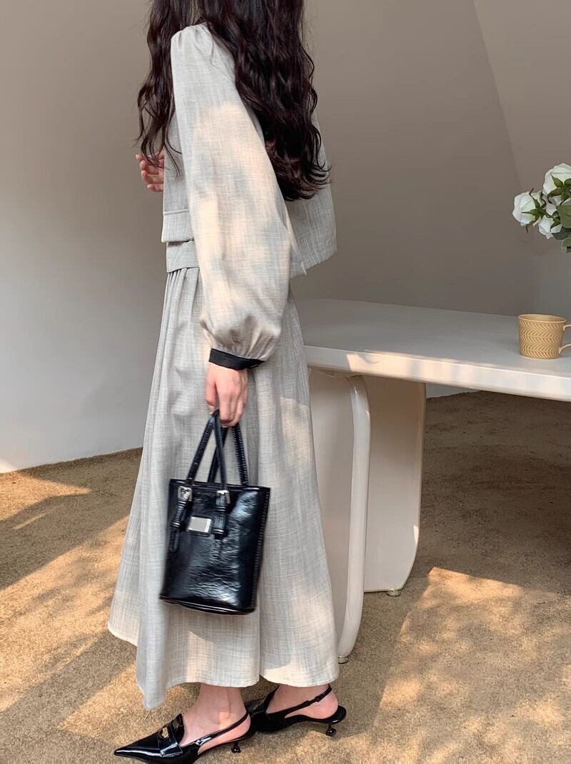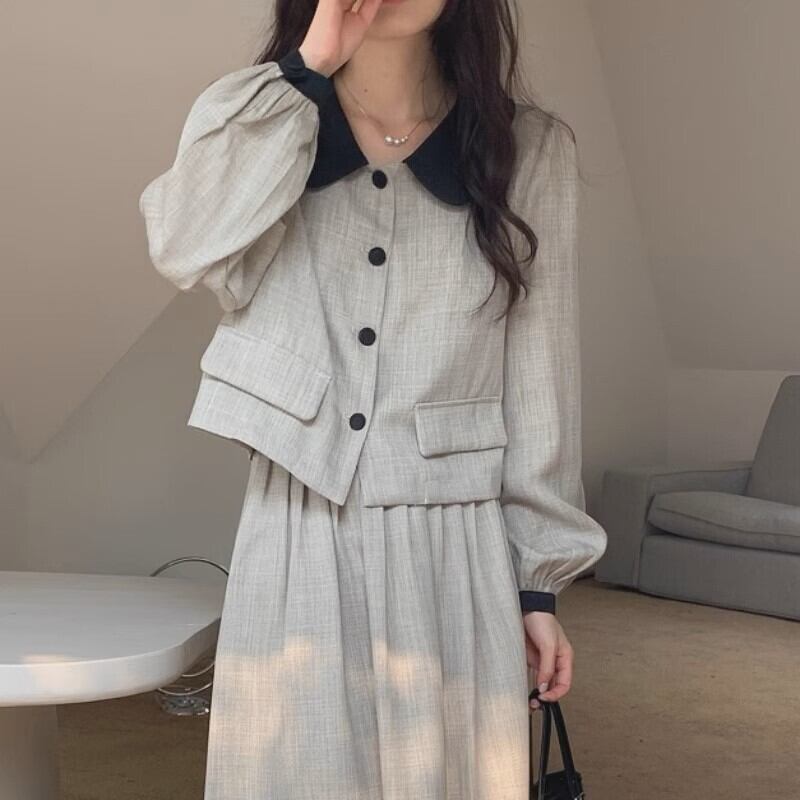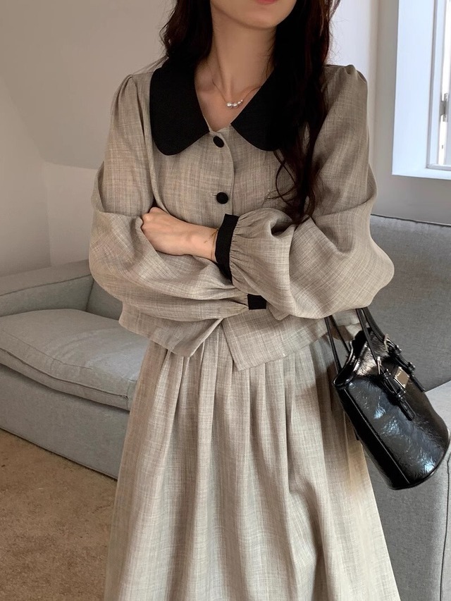 ツーピース セットアップ レディース スカート トップス ジャケット 上着 ロング 長袖 ボリューム袖 襟付き 丸襟 フレア Aライン 前開き コンサバ ボタン バイカラー 配色 柔らか 大人可愛い シンプル カジュアル おしゃれ レトロ こなれ感 ラフ ルーズ モダン フォーマル 抜け感 ラグジュアリー ロマンティック フェミニン 大人女子 無地 秋 会議 プレゼン オフィス ビジネス デート パーティー 婚活 お呼ばれ コーデ 楽ちん 体型カバー 普段使い 着回し 清楚 ゆったり フリーサイズ グレー