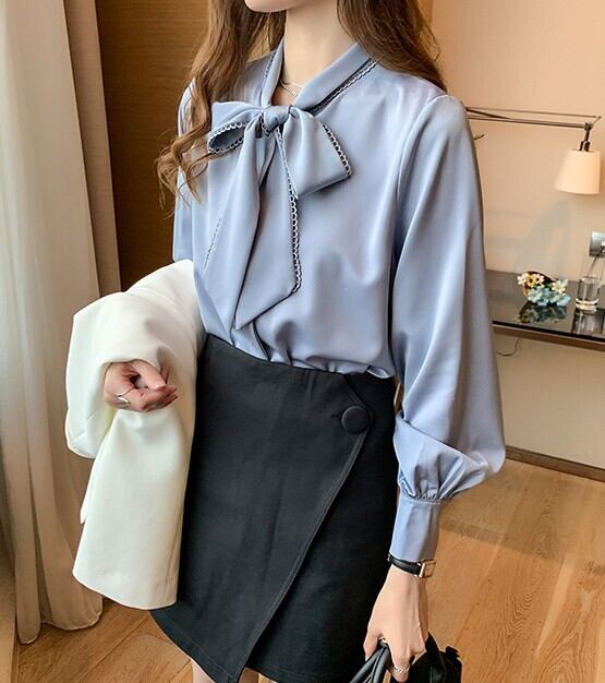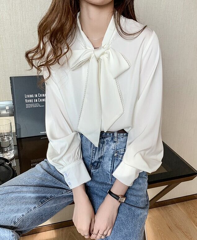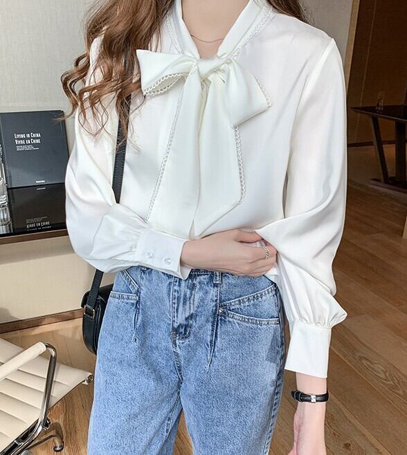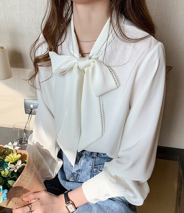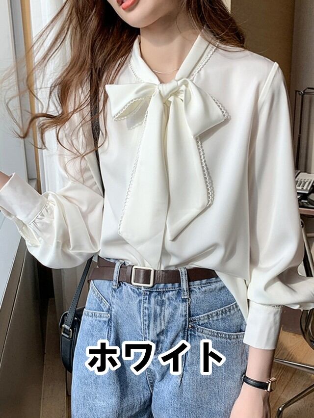 トップス レディース 送料無料 2色 シャツ ブラウス リボンタイ ボウタイ シンプル ヴィンテージ ランタンスリーブ パフスリーブ レーストリム ロングスリーブ ストレート Iライン ホワイト ブルー 白 青 水色 無地 トレンド かわいい 可愛い カジュアル シンプル きれいめ 上品 エレガント こなれ感 抜け感 ラブリー キュート ガーリー フェミニン 春 春服 夏 夏服 秋 秋服 冬 冬服 デート おでかけ 学生 着回し 普段使い 10代 20代 30代 S M L XL 2XL