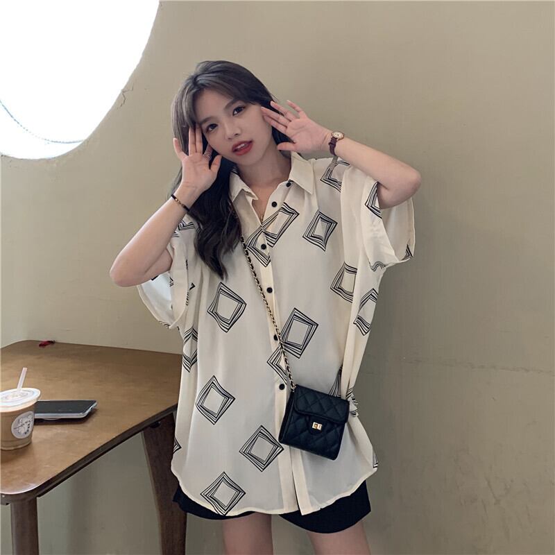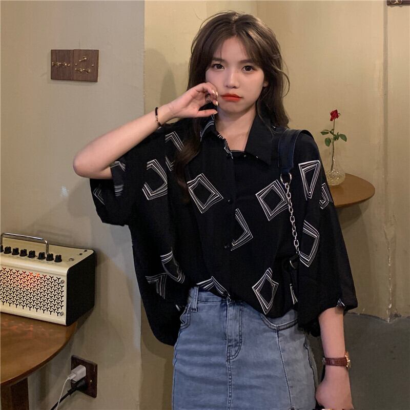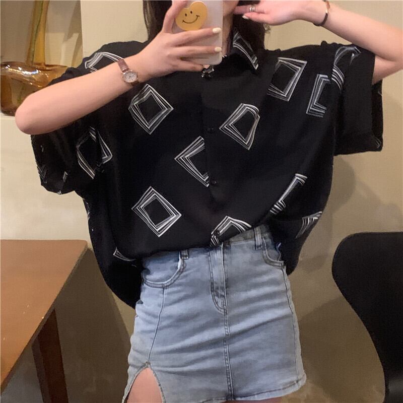 トップス レディース 送料無料 2色 シャツ ブラウス 襟付き 幾何学 スクエア プリントドロップショルダー 五分袖 ゆったり ビッグシルエット オーバーサイズ マニッシュ メンズライク 抜け感 こなれ感 シック クール 個性的 華やか 派手 無地 春 秋 10代 20代 普段使い 重ね着 着回し おしゃれ お洒落 ラフ カジュアル 前開き 涼し 通気性 薄手 ワイド 存在感 モード系 デート ブラック ベージュ ワンサイズ