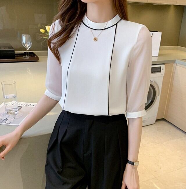 袖をシアーシフォンに切り替えた五分袖ブラウスです。