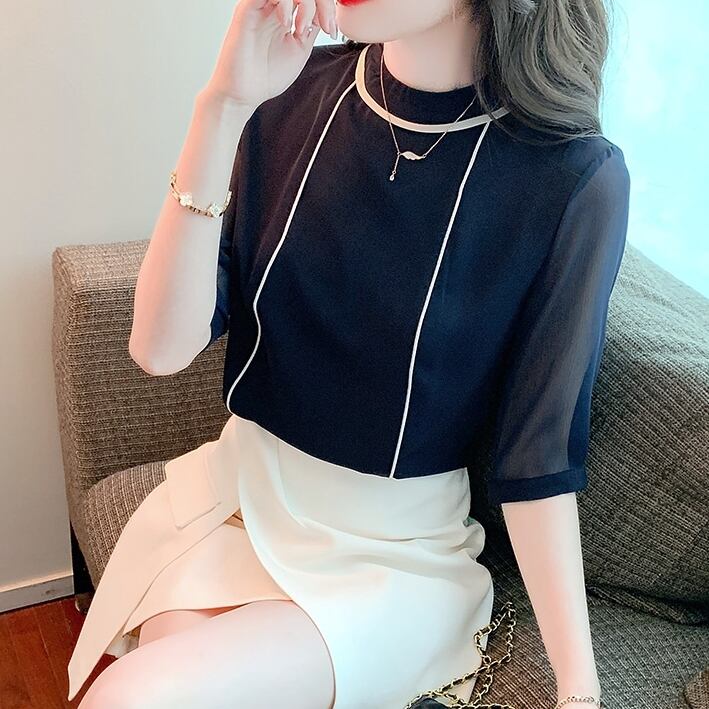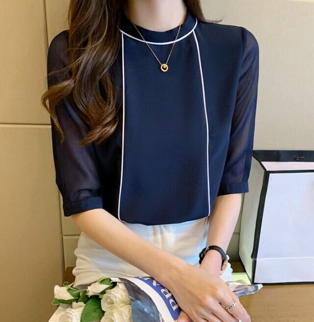 シャツ レディース ニッチウェア 送料無料 2色 ブラウス スタンドカラー シフォン チュール メッシュ ライン レース 五分袖 フレア 襟付き パフスリーブ パワーショルダー 大人可愛い きれいめ フェミニン おしゃれ お洒落 上品 エレガント 大人女子 こなれ感 抜け感 春 夏 普段使い モテ 美脚 デート お出かけ 女子会 20代 30代 ファッション スタイル モード ネイビー ホワイト S M L XL 2XL