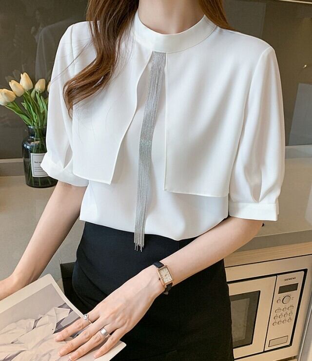 トップス レディース 送料無料 ブラウス シャツ 立ち襟 スタンドカラー フリンジ クルーネック 半袖 五分袖 5分袖 タック パフスリーブ ワイド ゆったり 楽ちん ホワイト フェミニン とろみ感 こなれ感 上品 エレガント シンプル 爽やか 清潔感 フレッシュ クール きれいめ 大人女子 大人可愛い かわいい おしゃれ お洒落 モダン シック カジュアル ラフ 透け感 シースルー 春服 夏服 10代 20代 30代 デート オフィス ビジネス 通勤 普段使い 着回し 流行 S M L XL 2XL