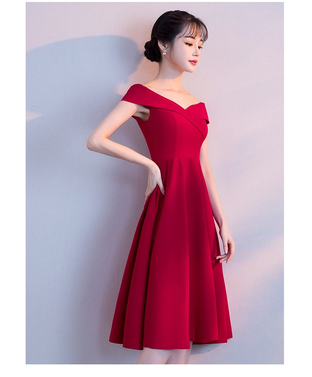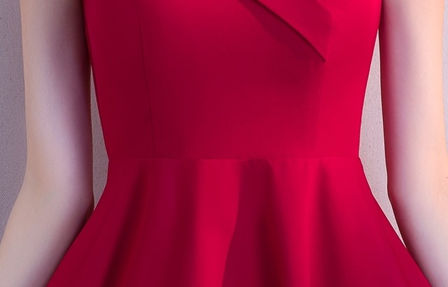 アシンメトリーな折り返した襟元がエレガントなパーティードレス。