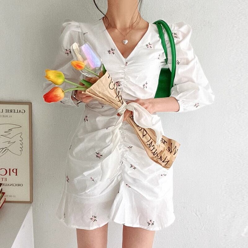 レディース ワンピース ショート 7分袖 パフスリーブ Vネック 襟なし ノーカラー フレア スリム リボン ウエストリボン 薄手 ハリ感 大人可愛い シンプル カジュアル おしゃれ レトロ こなれ感 ラフ ガーリー 個性的 存在感 抜け感 ラブリー キュート ラグジュアリー ナチュラル 休日感 フェミニン あざとい 大人女子 活発 お茶目 ニッチ 花柄 フラワー 夏 デート お出かけ アウトドア 旅行 休日 ショッピング 合コン 楽ちん 普段使い 着回し モテ トレンド S M ゆとり感 ホワイト
