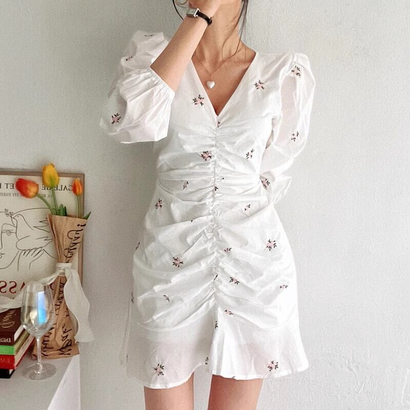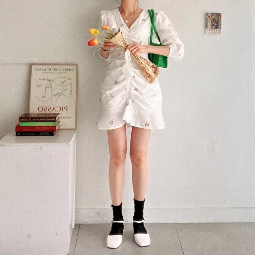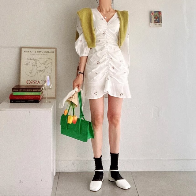 大人可愛いレディースのショートワンピースは、控えめな花柄が魅力的。フロントのギャザーが個性的なシルエットを演出し、パフスリーブとVネックが女性らしい印象に。ウエストリボンがアクセントを加え、メリハリのあるシルエットを強調します。フェミニンでちょっぴりあざとさも感じられる大人の可愛いを詰め込んだワンピースです◎