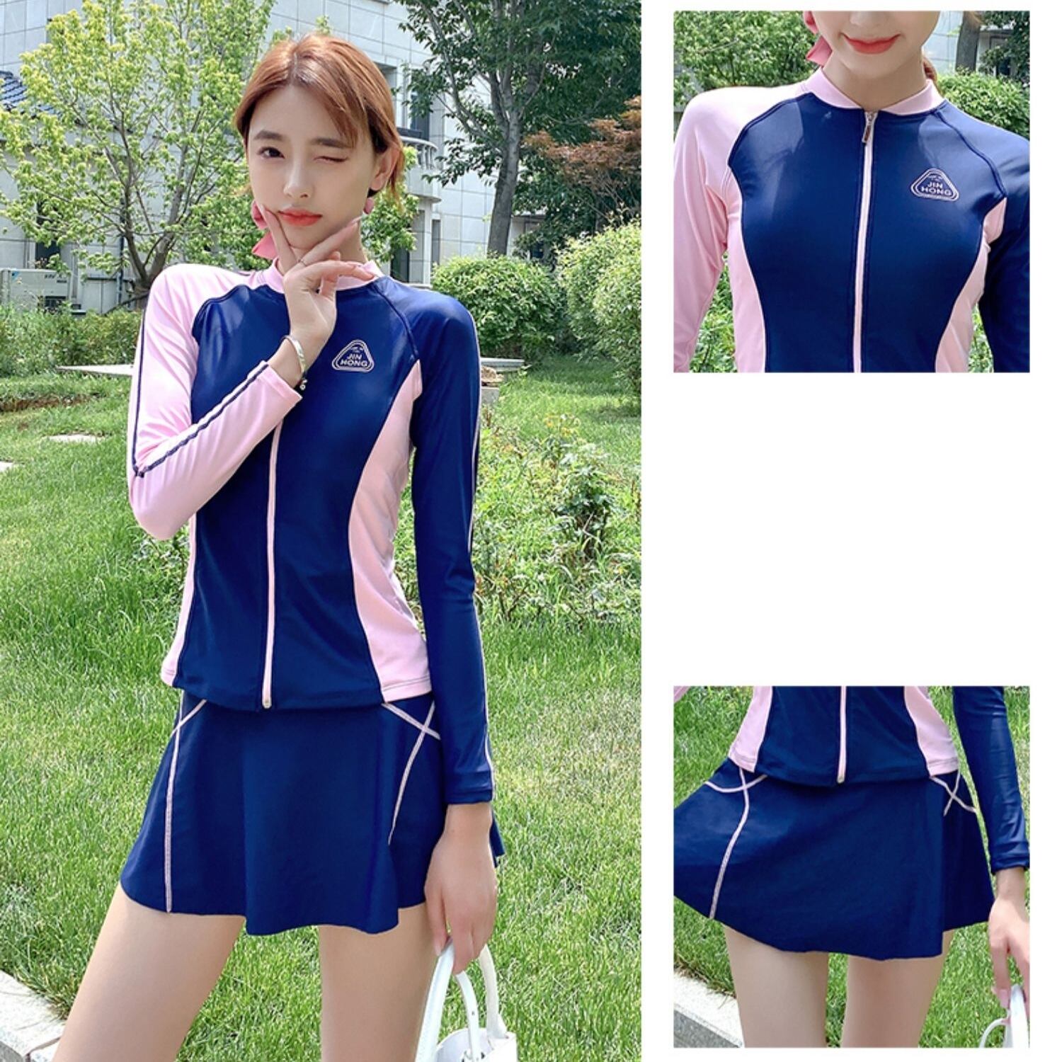 水着 レディース 送料無料 2色 バイカラー ライン ジップ フレアスカート インナーパンツ付き 裏地付き ワンピース 長袖 ラッシュガード スポーツ水着 スイムウェアフィットネス クルーネック UV対策 フレアスカート 10代 20代 30代 40代 50代 カジュアル スポーティ M L XL 2XL ブラック ブルー 大きいサイズ プラスサイズ
