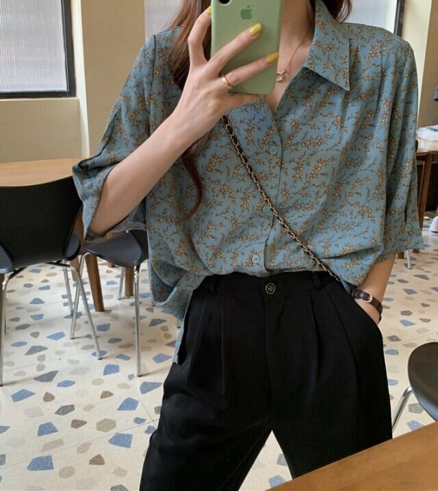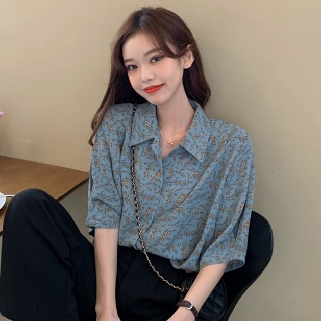 ブラウス トップス レディース 送料無料 シャツ タック 半袖 シフォン 小花柄 花柄 キャンディースリーブ こなれ感 抜け感 ガーリー かわいい 可愛い キュート 上品 エレガント きれいめ ラブリー 女の子 お洒落 おしゃれ 春 春服 夏 夏服 10代 20代 デート おでかけ モテ 女子会 普段使い 着回し 重ね着 定番 ブルー S M L XL 韓国系 オルチャン
