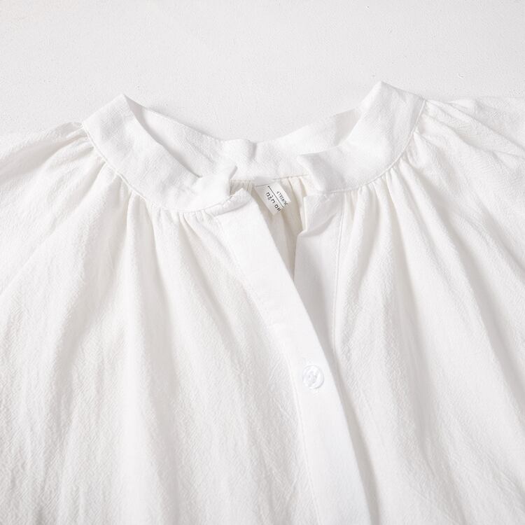 肩のギャザーからふんわりと広がる女性らしいAラインに。