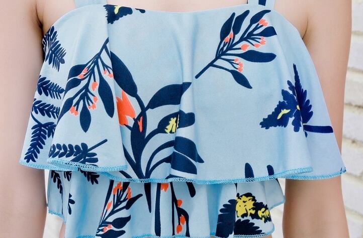 フリルのボリューム感が体型をカバーするボタニカル柄のタンキニです。