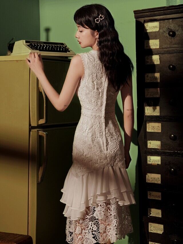 ワンピース レディース 送料無料 総レース フレア ノースリーブ イレギュラーヘム シフォン 切り替え ドッキング アシンメトリー クルーネック シースルー レイヤード パンチングレース リーフ模様 タイトドレス 花柄 パーティドレス ひざ丈 ミモレ丈 袖あり フレアスリーブ レース 透け感 シースルー エレガント 大人可愛い きれいめ ゴージャス 華やか 上品 白 ホワイト 花柄 フラワー ブライダル 披露宴 オケージョン 二の腕カバー 高見え 格上げ 春夏 パーティー 二次会 S M L XL