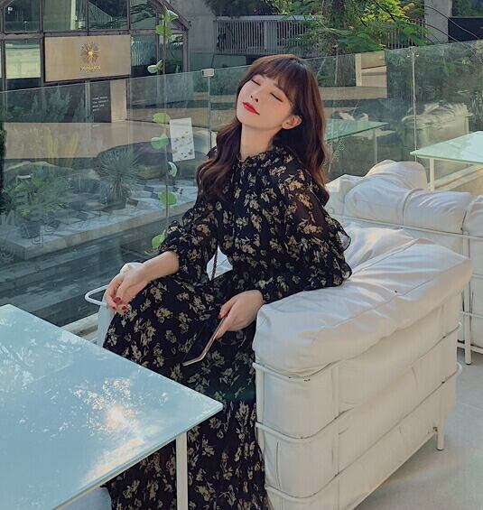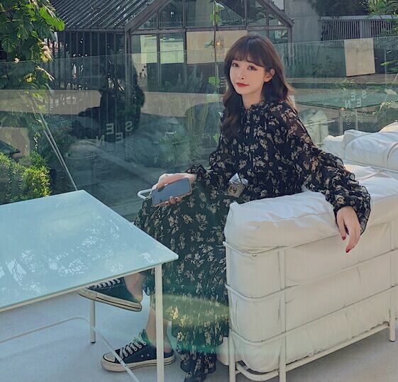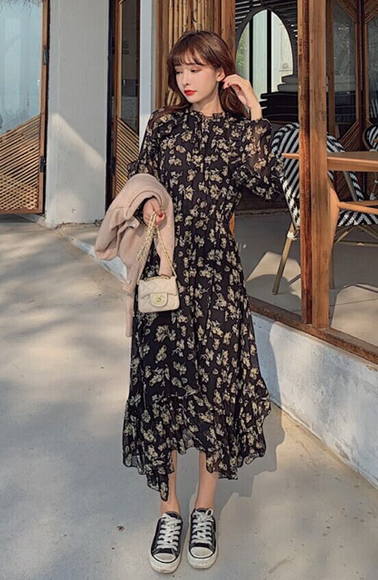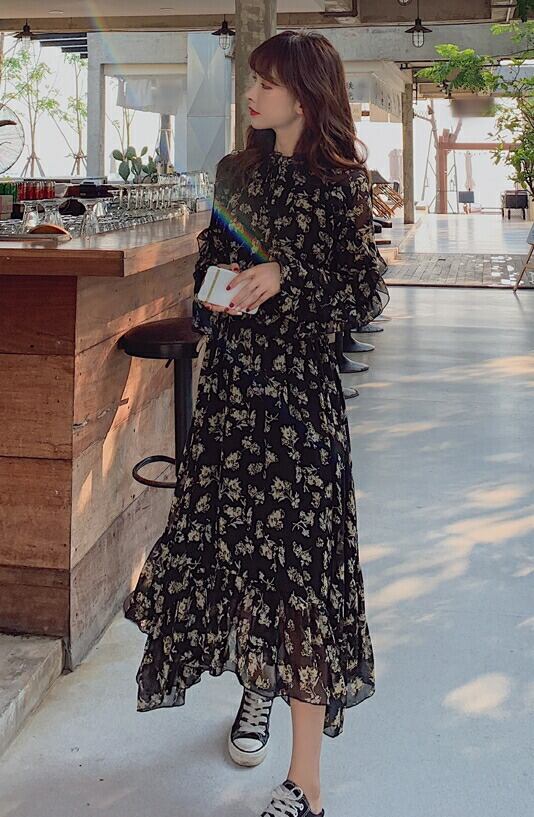 ワンピース レディース 送料無料 シフォン フレア 長袖 ロング丈 クルーネック フリル バイカラー おしゃれ エレガント レトロ クラシカル 花柄 スタイル 小顔見せ 着痩せ 体型カバー インスタ トレンド きれいめ フェミニン 大人かわいい フリル フレアスカート ドレープ とろみ感 透け感 旅行 デート お呼ばれ オフィス 通勤 お出かけ ナチュラル ハイウエスト フラワープリント ギャザー ガーリー キュート ウエストリボン ブラック S M L XL ハイウエスト