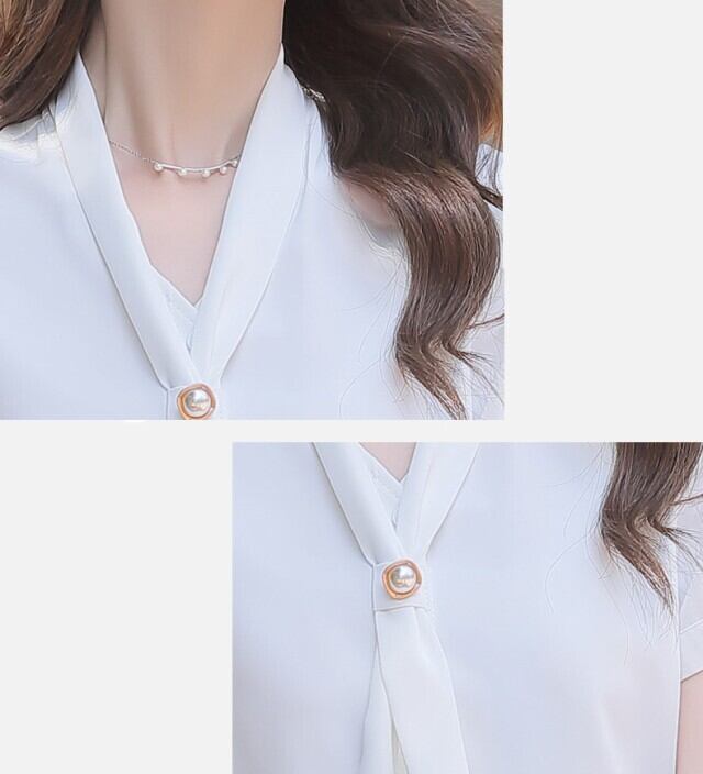 トップス レディース 送料無料 2色 シャツ ブラウス 半袖 襟付き ラウンドネック パール ネクタイ リボン リボンタイ ゆったり 抜け感 こなれ感 シック クール カッコイイ かっこいい 個性的 華やか 派手 無地 春 春服 春物 秋 秋服 秋物 10代 20代 普段使い 重ね着 着回し おしゃれ お洒落 ラフ カジュアル 前開き ホワイト グリーン 涼し 通気性 薄手 ポリエステル シフォン シャツ ワイド 存在感 モード系 エキゾチック デート S M L XL 2XL 3XL 4XL