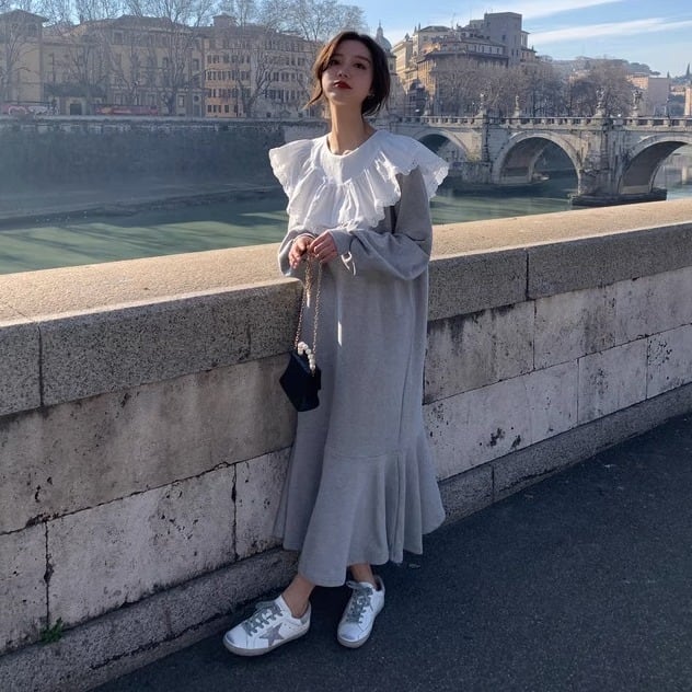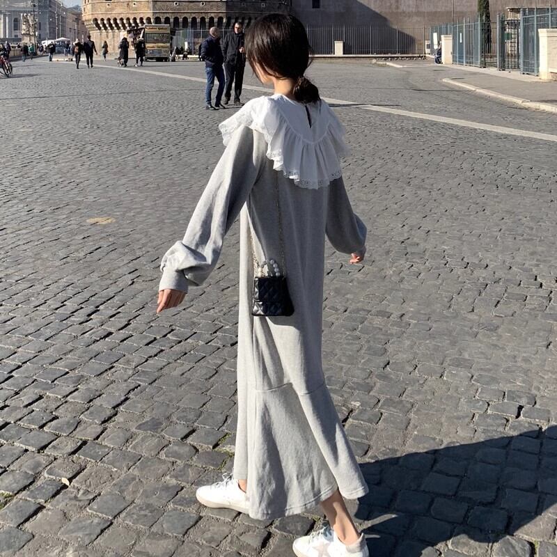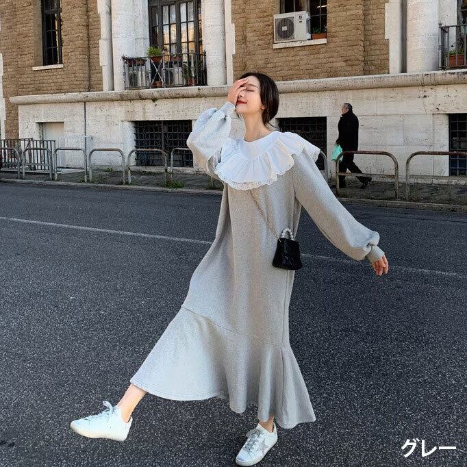 レディース ワンピース スウェット スウェットワンピース ミモレ ロング 長袖 ボリューム袖 パフスリーブ ラウンドネック ラッフルカラー ワイド フレア 切り替え レース フリル 切り替えデザイン バイカラー 配色 異素材ミックス 大人可愛い シンプル カジュアル レトロ こなれ感 ラフ ガーリー ルーズ 個性的 存在感 抜け感 ラブリー フェミニン 活発 お茶目 ニッチ リラックス 無地 秋 冬 アウトドア 休日 ショッピング カフェ 韓国 楽ちん 体型カバー 普段使い S M L ゆったり グレー