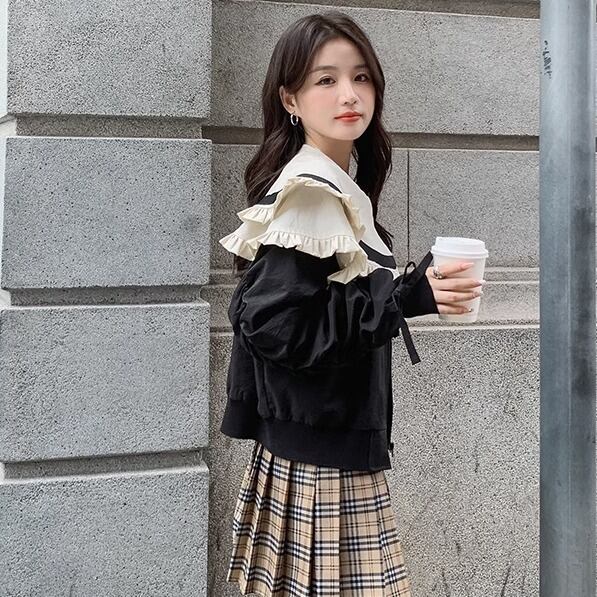 レディース ジャケット ブルゾン アウター 上着 スタジャン 長袖 襟なし ノーカラー ラッフルカラー ワイド オーバーサイズ ティアード フリル リボン ファスナー 前開き ギャザー 切り替えデザイン バイカラー 配色 光沢 大人可愛い カジュアル おしゃれ レトロ こなれ感 ラフ ガーリー ルーズ 個性的 存在感 抜け感 ラブリー ラグジュアリー アクティブ ロマンティック フェミニン 活発 お茶目 ニッチ 無地 秋 冬 アウトドア 合コン レジャー 楽ちん 体型カバー 普段使い 着回し ゆったり