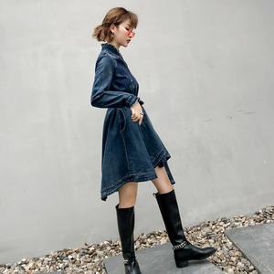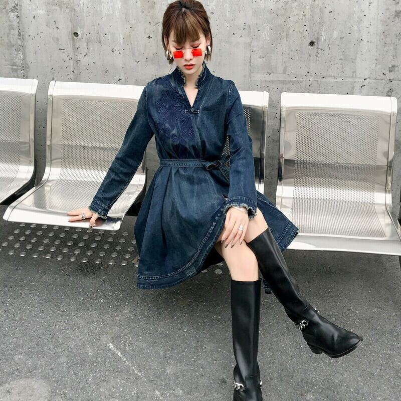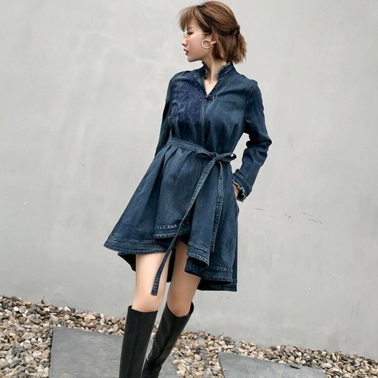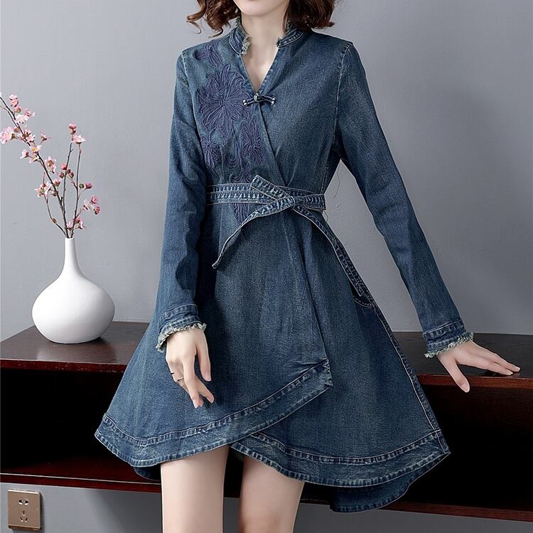 ワンピース レディース 送料無料 シャツワンピース デニム 長袖 刺繍 幾何学模様 アジアン フリンジ カットオフ イレギュラーヘム アシンメトリー 切り替え キーネック 前開き ウエストベルト ミディアム丈ひざ下 無地 クルーネック ゆったり ボリューム 体型カバー おしゃれ 大人カジュアル きれいめ 無地 シンプル かっこいい 春 秋 冬 10代 20代 30代 韓国ファッション オルチャン ブルー M L XL