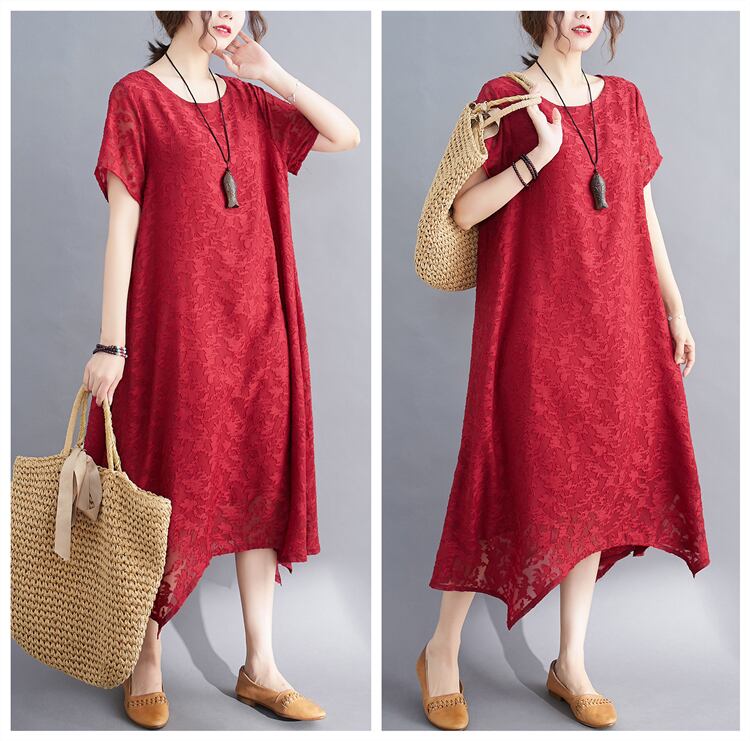 ワンピース レディース ドレス 送料無料 3色 総レース ドレス 切り替え アシンメトリー イレギュラーヘム 半袖 シャツワンピース ミモレ丈 クルーネック 切り替えデザイン レース 透け感 大人可愛い きれいめ ゴージャス レトロ キュート ガーリー クール モード系 レッド 黒 ブラック ネイビー インスタ映え 春 夏 大人 おしゃれ デイリー パーティー 二次会 M L XL 2Xl 大きいサイズ