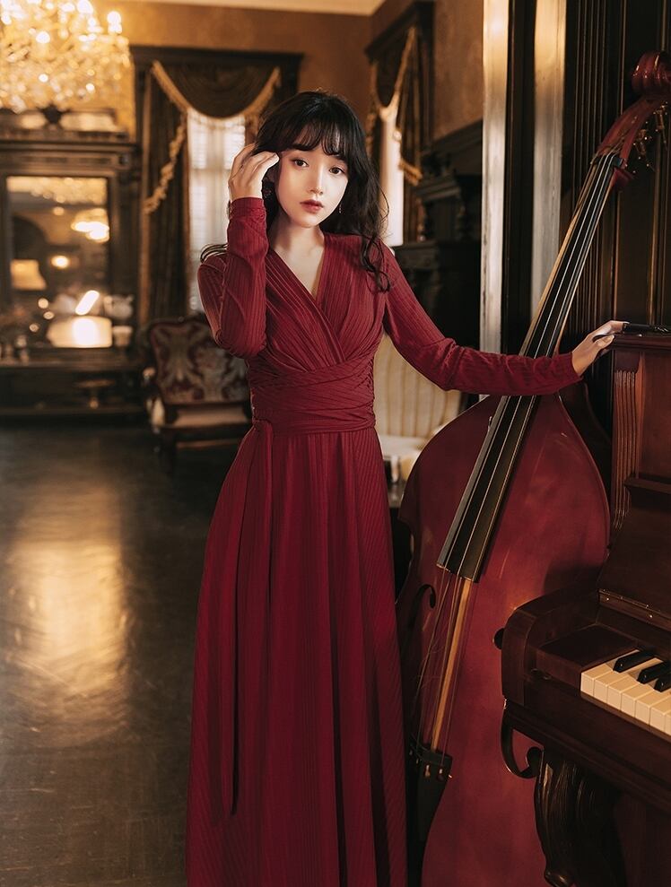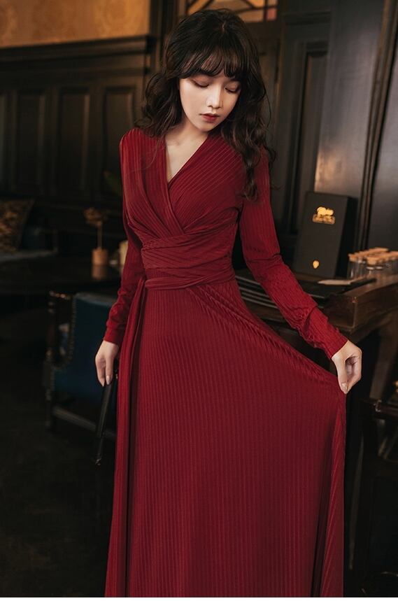 ワンピース レディース 送料無料 フレア ウエストリボン フレア ロング丈 ストライプ ウエストマーク ギャザー ミモレ丈 カシュクール Vネック タック 長袖 ロングスリーブ パフスリーブ ボリューム袖 パワーショルダー ハイウエスト ウエストマーク 体型カバー 二の腕カバー 脚長 細見え スリム フィット感 スタイルアップ きれいめ 上品 エレガント こなれ感 大人女子 大人可愛い 清楚 清潔感 おしゃれ お洒落 シンプル 春服 秋服 20代 30代 40代 新作 ワインレッド S M L