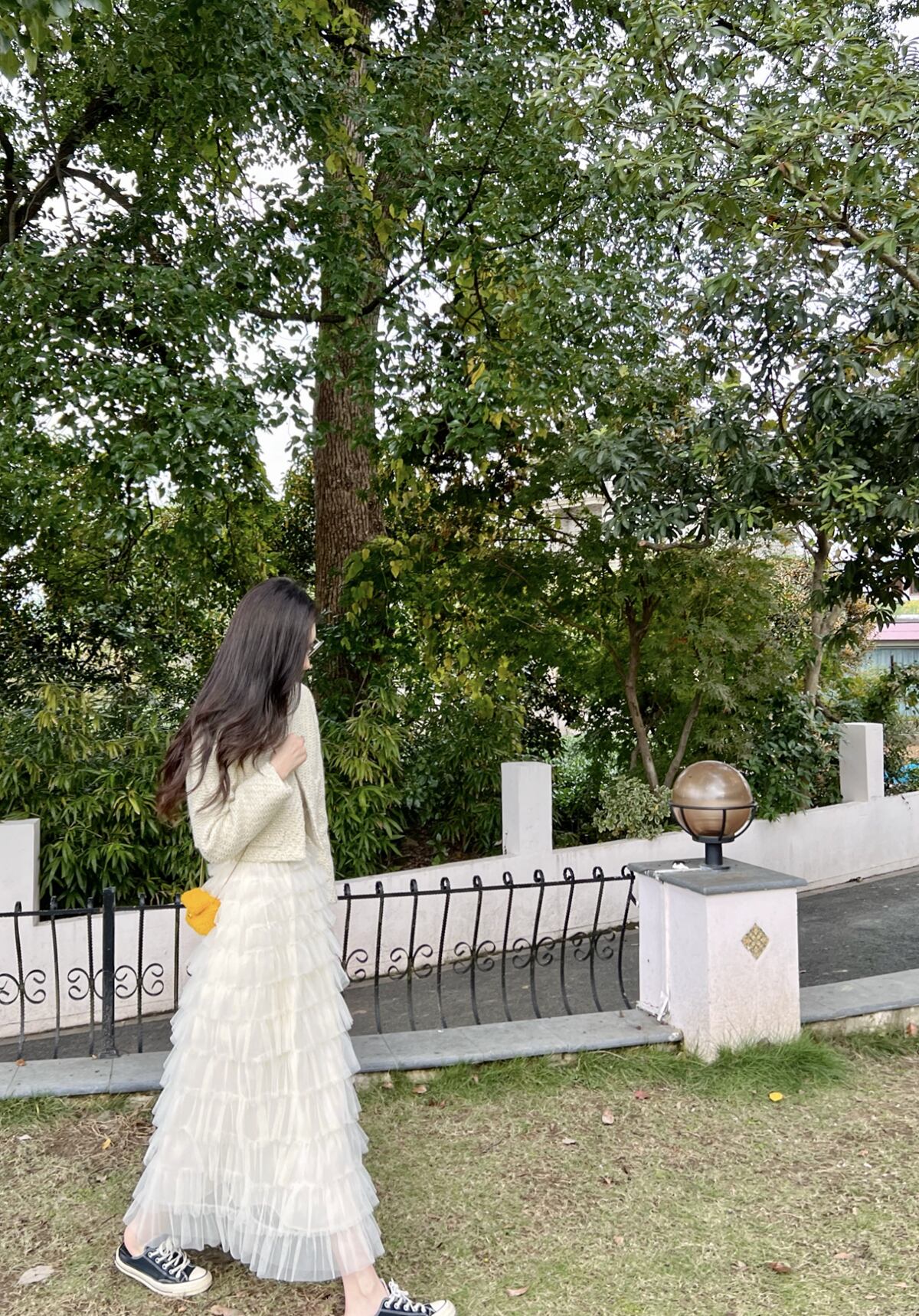 ツイードのクロップ丈ノーカラージャケットはクラシカルで、主役級のスカートが便利です。
