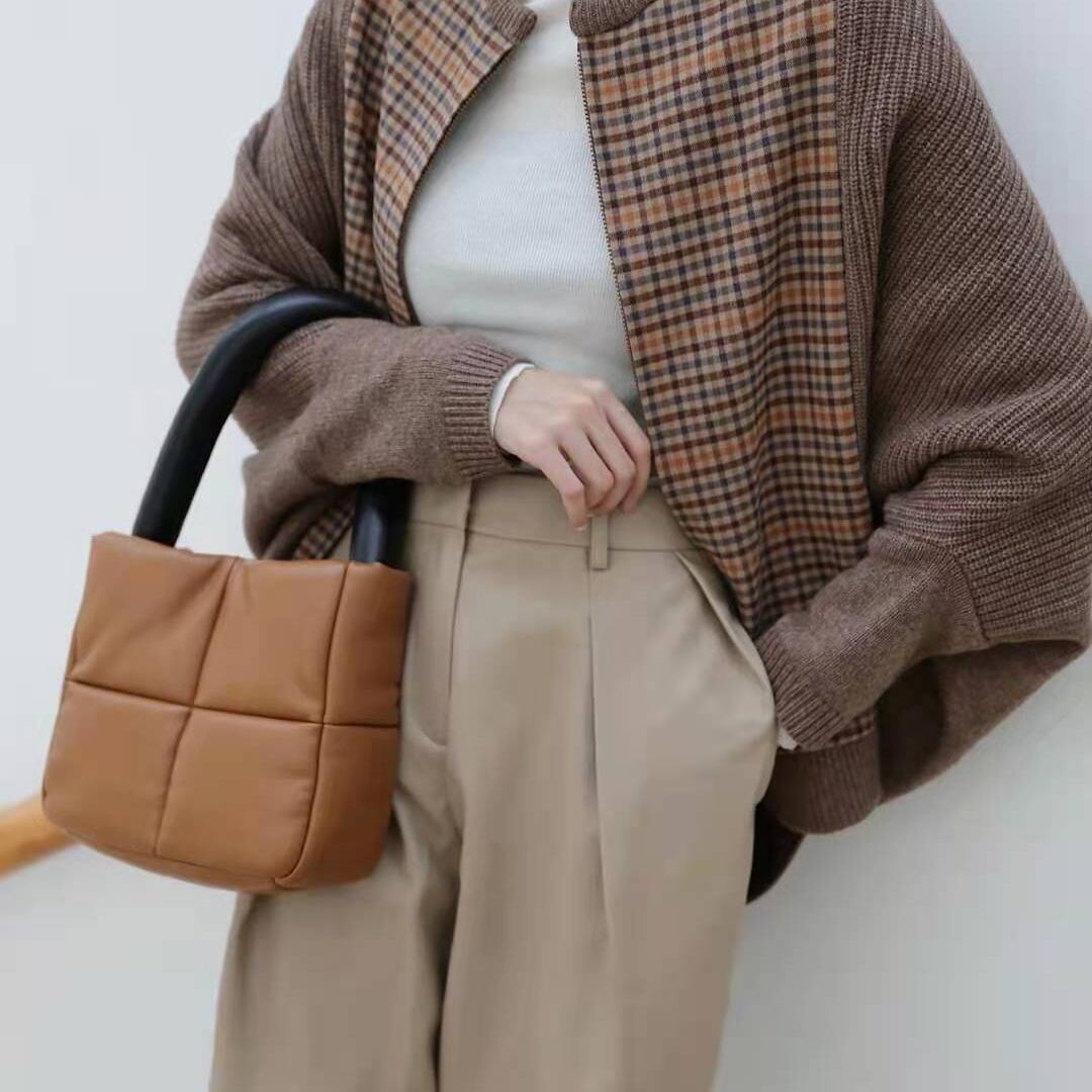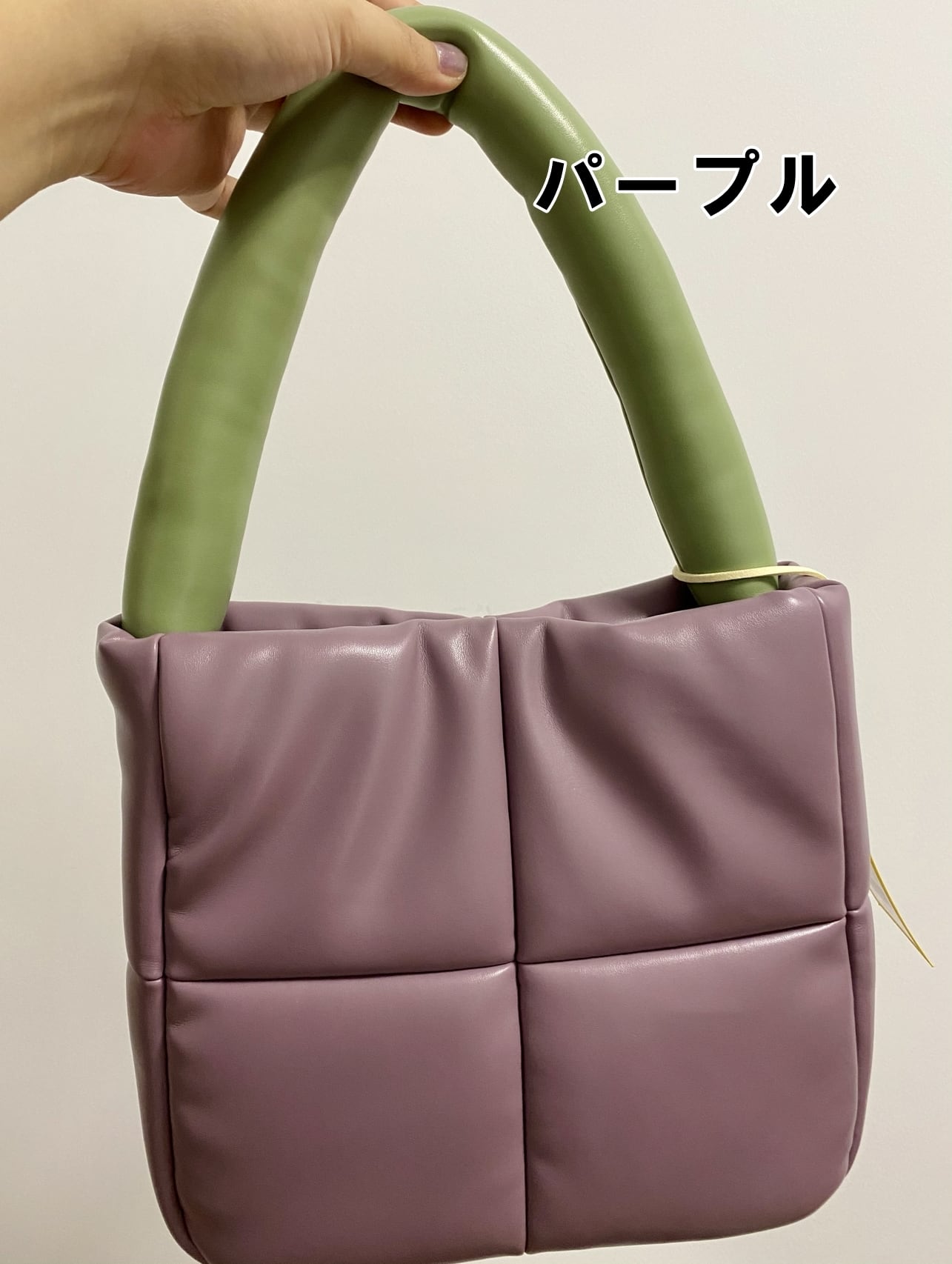 フェイクレザーのツヤ感とキルティングのもこもこ感が可愛いショルダーバッグ。