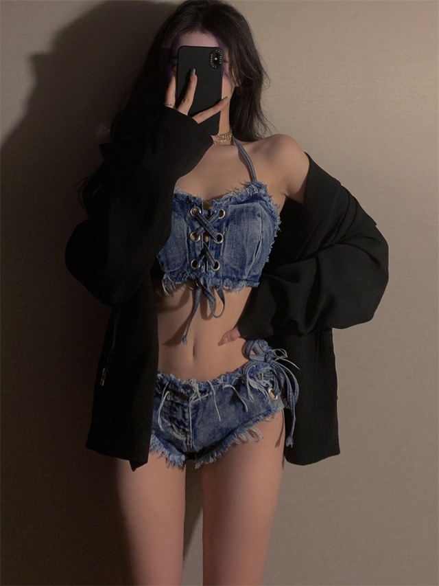 水着 レディース 送料無料 デニム ブルー M L XL ビキニ タンキニ ショートパンツ レースアップ フリンジ カットオフ ウォッシュ加工 リボン ハイウエスト ローライズ スポーティー カジュアル かわいい 大人可愛い 女の子 セパレート レトロ 韓国 おしゃれ バックリボン スウィート キュート ガーリー セット