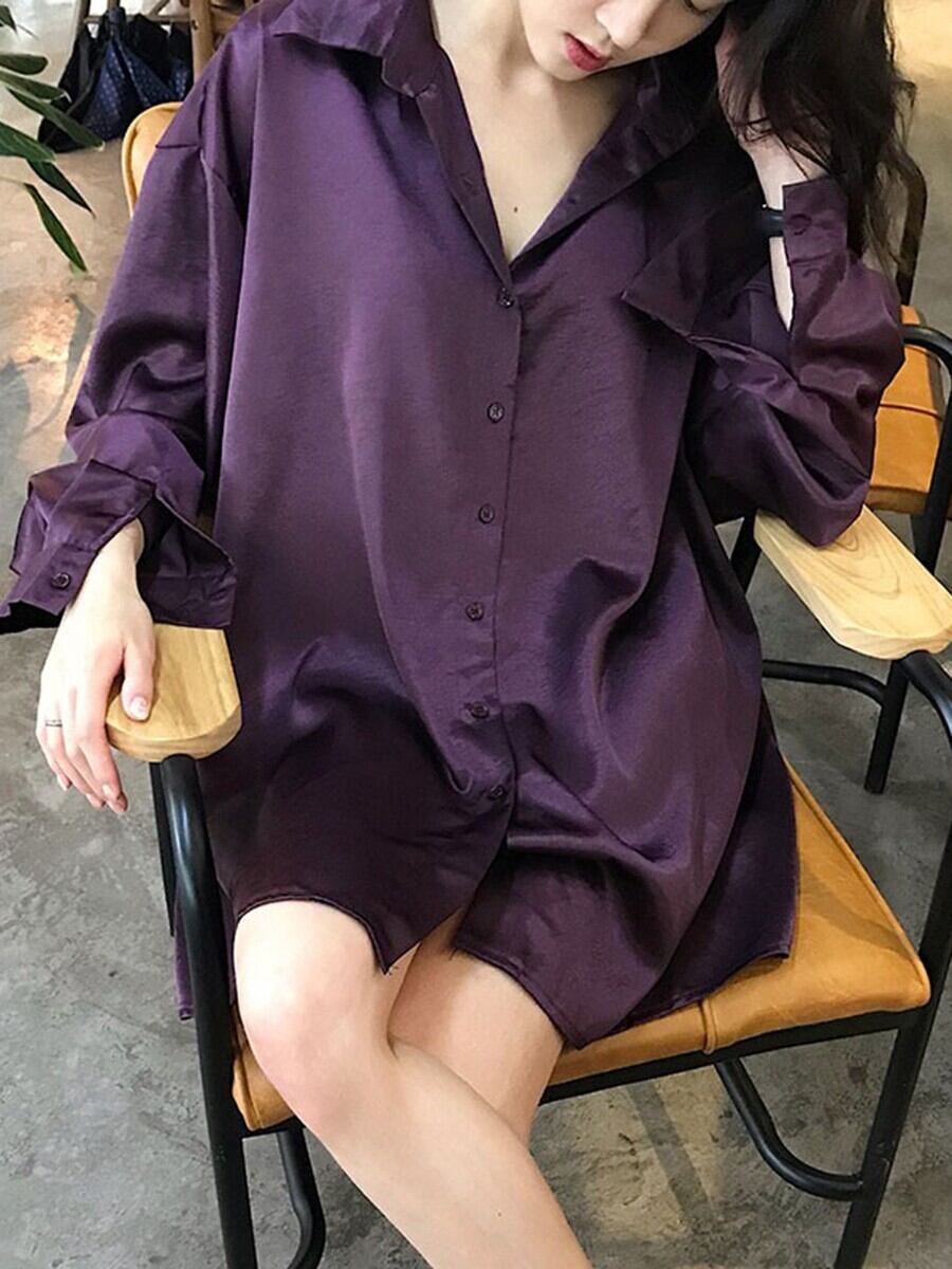 スタイリッシュな大きめパールボタン付きのサテン調ブラウス。
