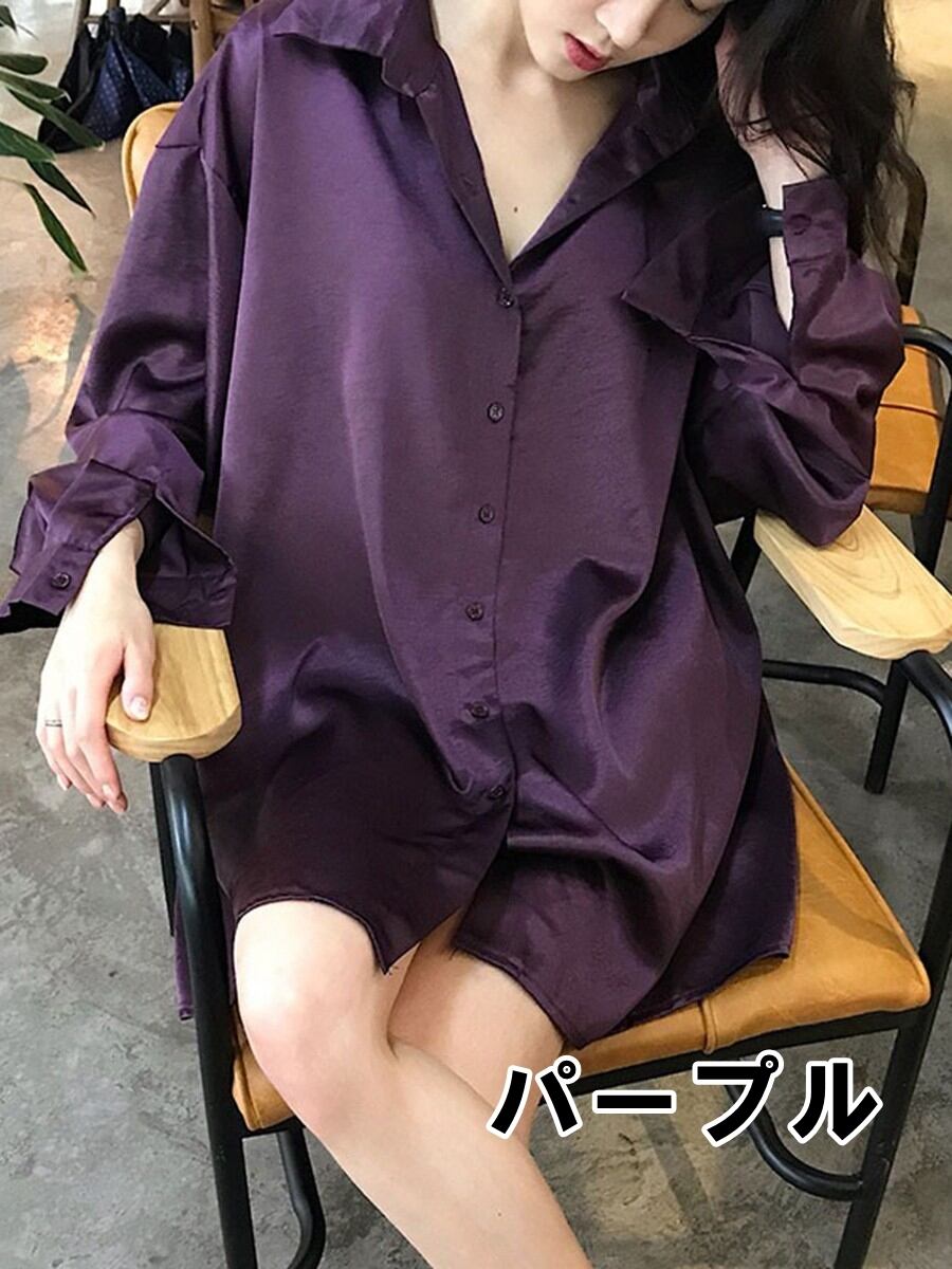 トップス レディース 送料無料 3色 ブラウス シャツ 襟付き 開襟 Vネック タック ギャザー ドロップショルダー 長袖 ロングスリーブ 前開き フロントボタン サテン ワイド ゆったり 大きめ 無地 フェミニン とろみ感 こなれ感 上品 エレガント シンプル カッコイイ かっこいい 清潔感 マニッシュ おしゃれ お洒落 モダン 春服 夏服 秋服 冬服 オールシーズン シーズンレス おでかけ デート オフィス ビジネス OL 通勤 20代 30代 40代 パープル ピンク ブラック S M L XL